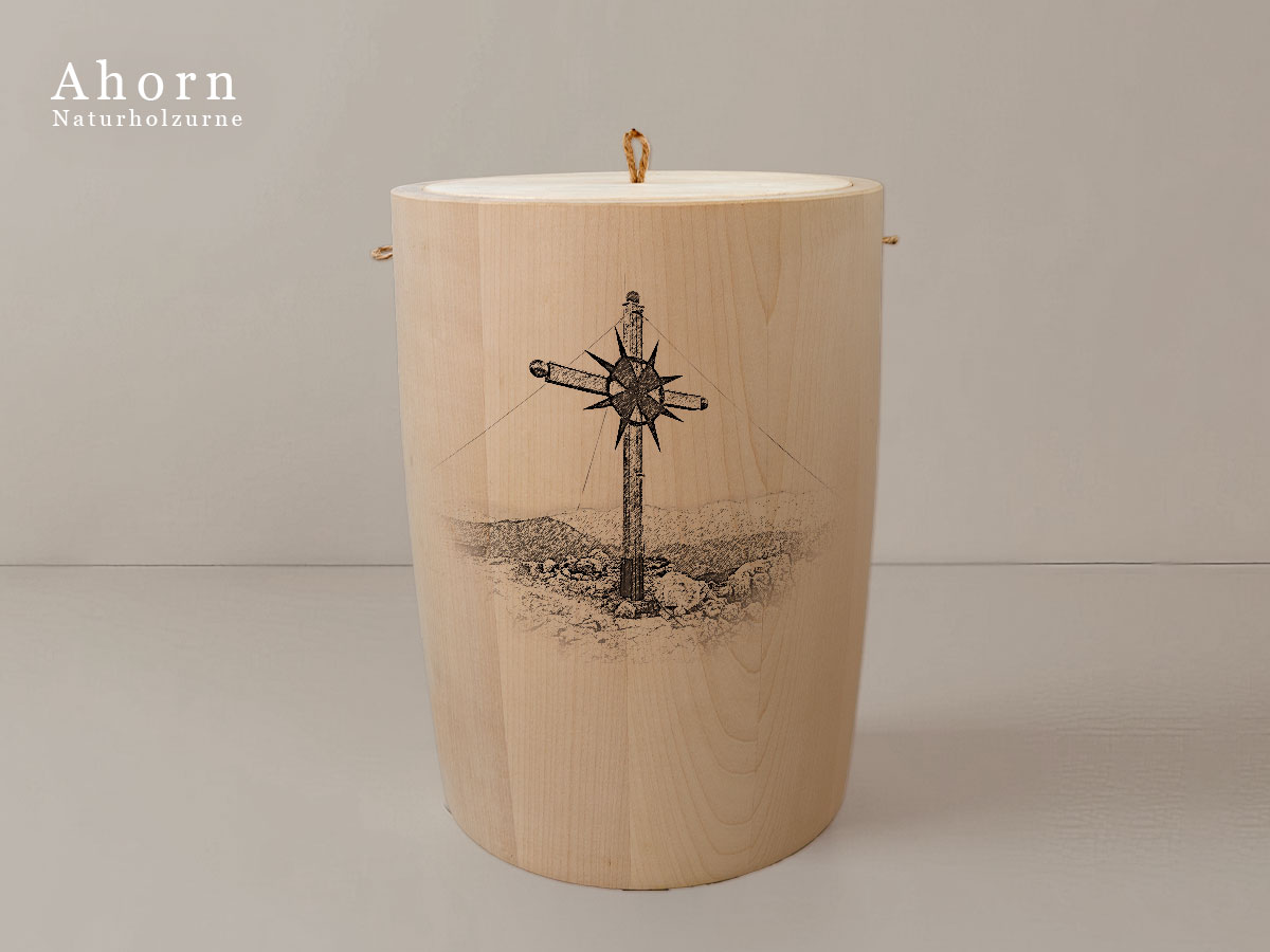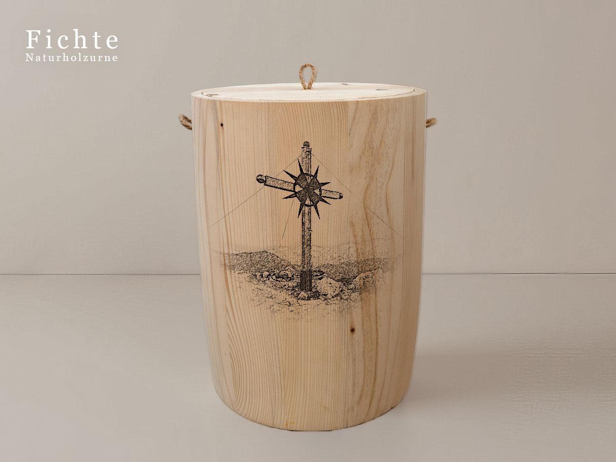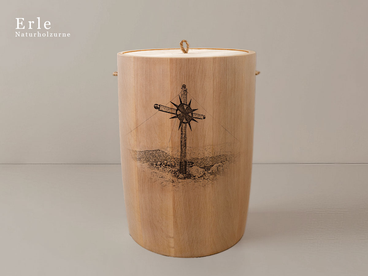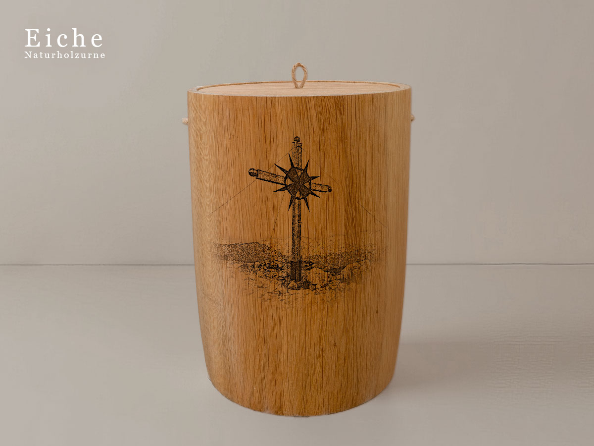 Das Motiv wird präzise in die Oberfläche der Urne gelasert, ohne Verwendung von Farben. So bleibt das natürliche Erscheinungsbild des Holzes erhalten und betont die schlichte Eleganz des Designs.