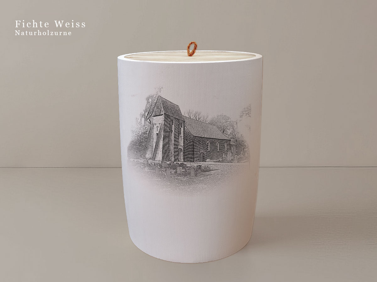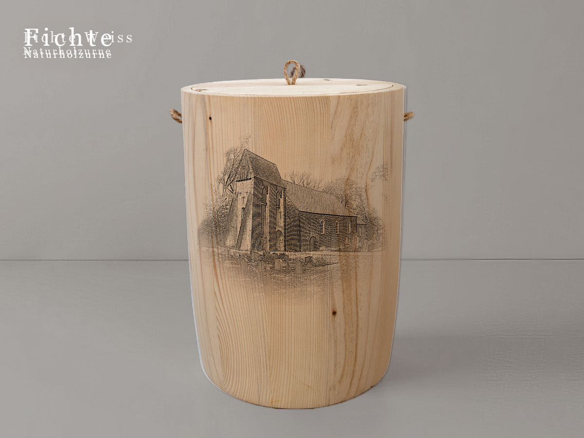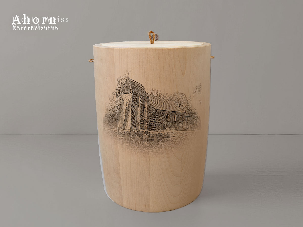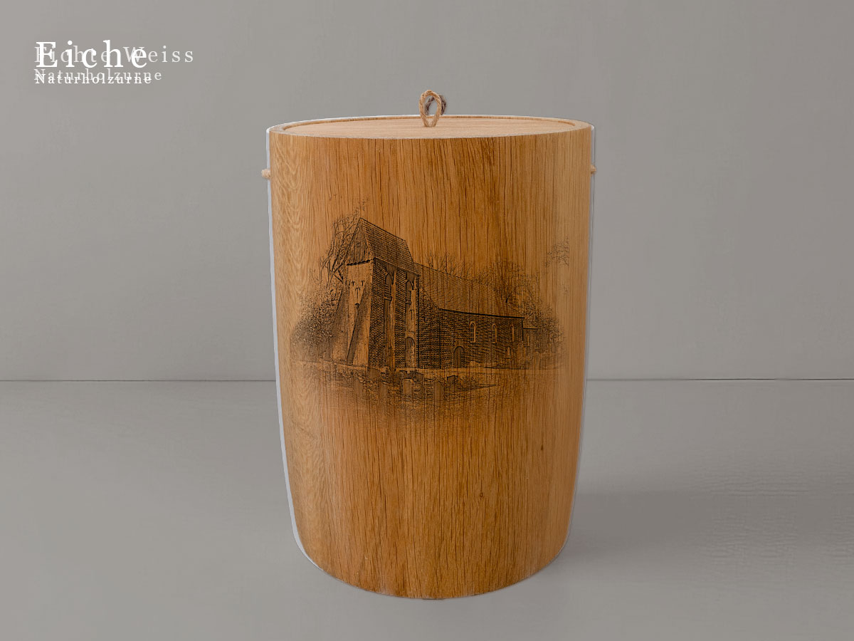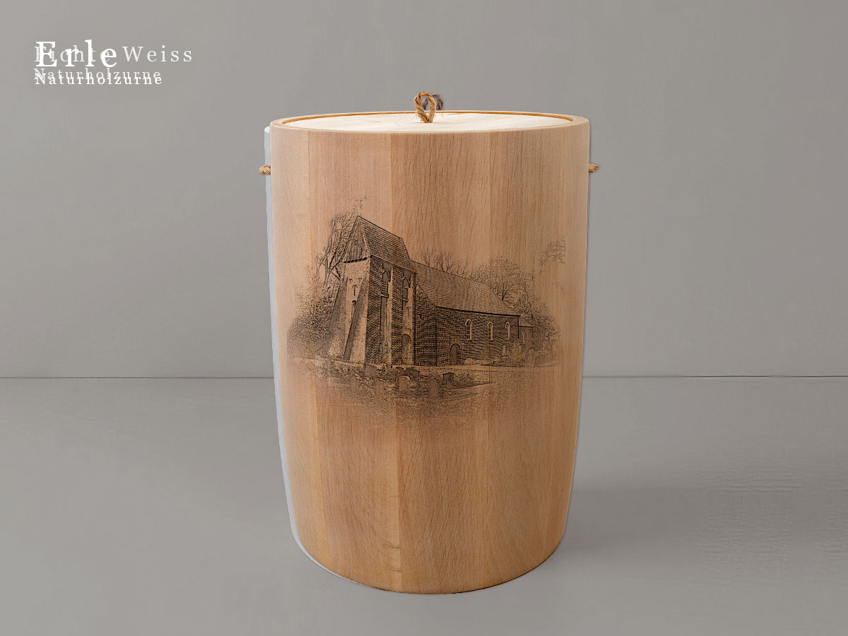 Das Motiv wird präzise in die Oberfläche der Urne gelasert, ohne Verwendung von Farben. So bleibt das natürliche Erscheinungsbild des Holzes erhalten und betont die schlichte Eleganz des Designs.