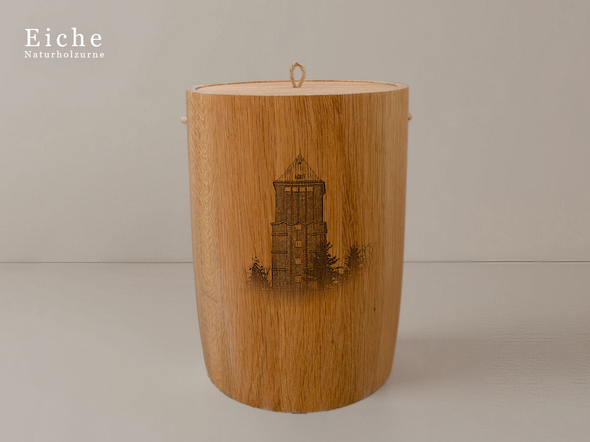 Das Motiv wird präzise in die Oberfläche der Urne gelasert, ohne Verwendung von Farben. So bleibt das natürliche Erscheinungsbild des Holzes erhalten und betont die schlichte Eleganz des Designs.