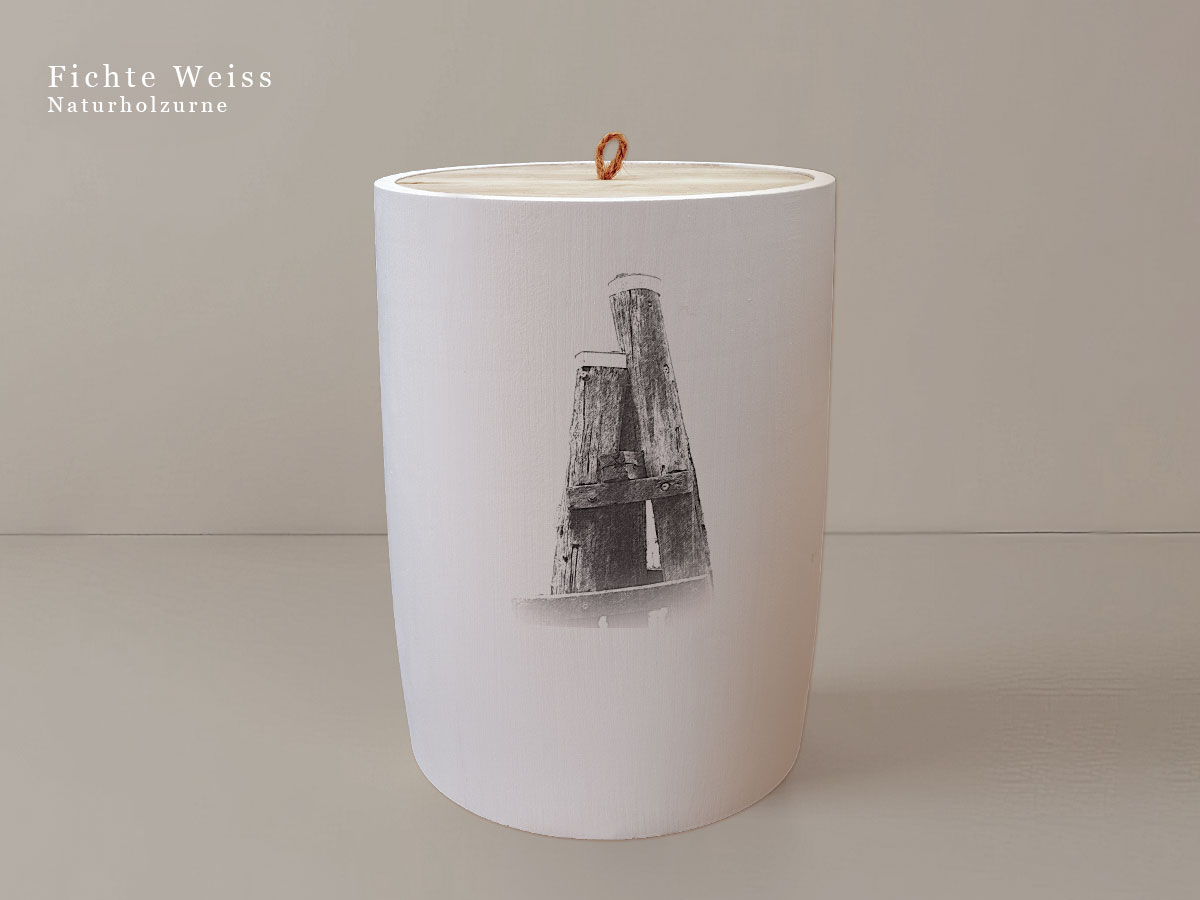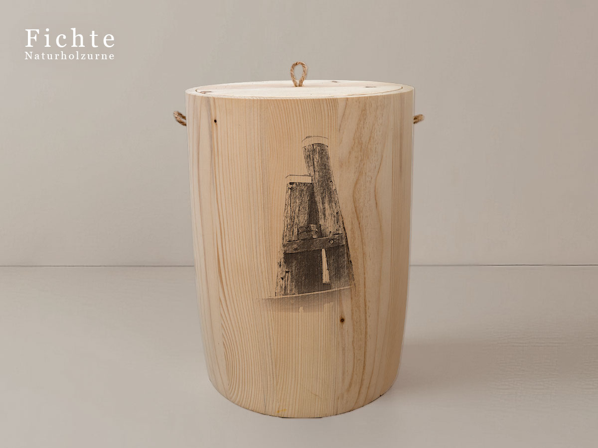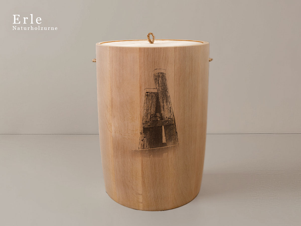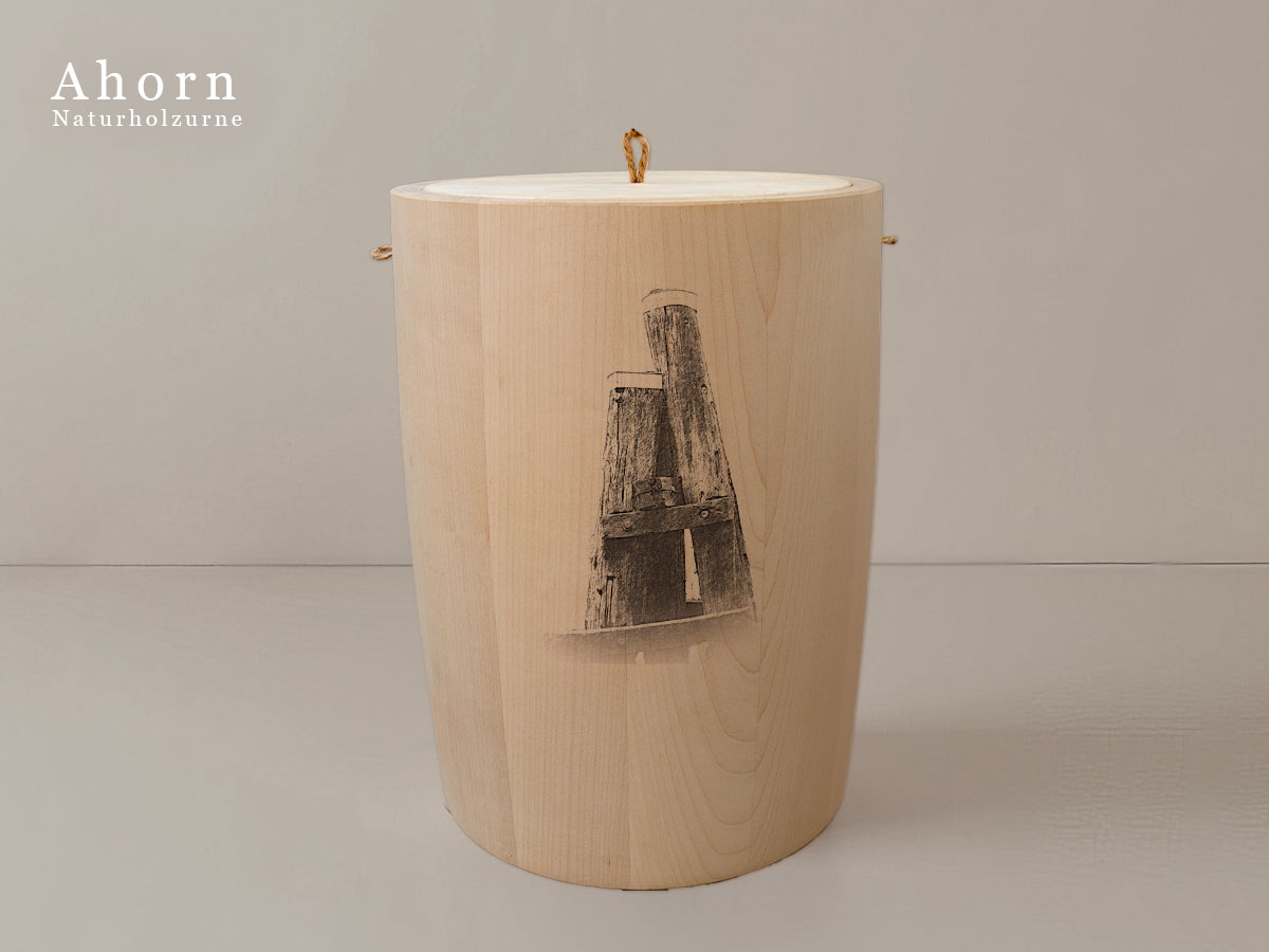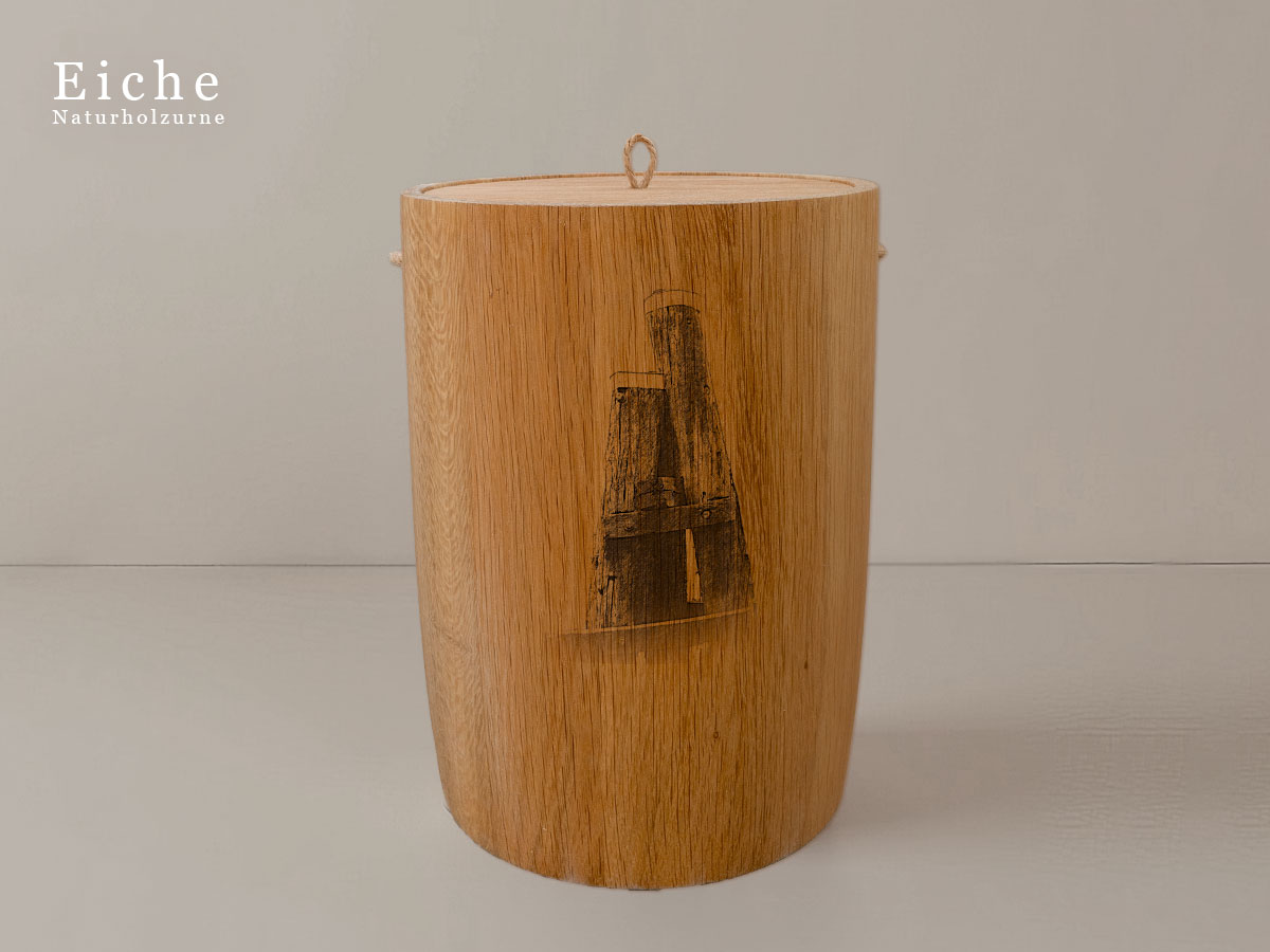 Das Motiv wird präzise in die Oberfläche der Urne gelasert, ohne Verwendung von Farben. So bleibt das natürliche Erscheinungsbild des Holzes erhalten und betont die schlichte Eleganz des Designs.