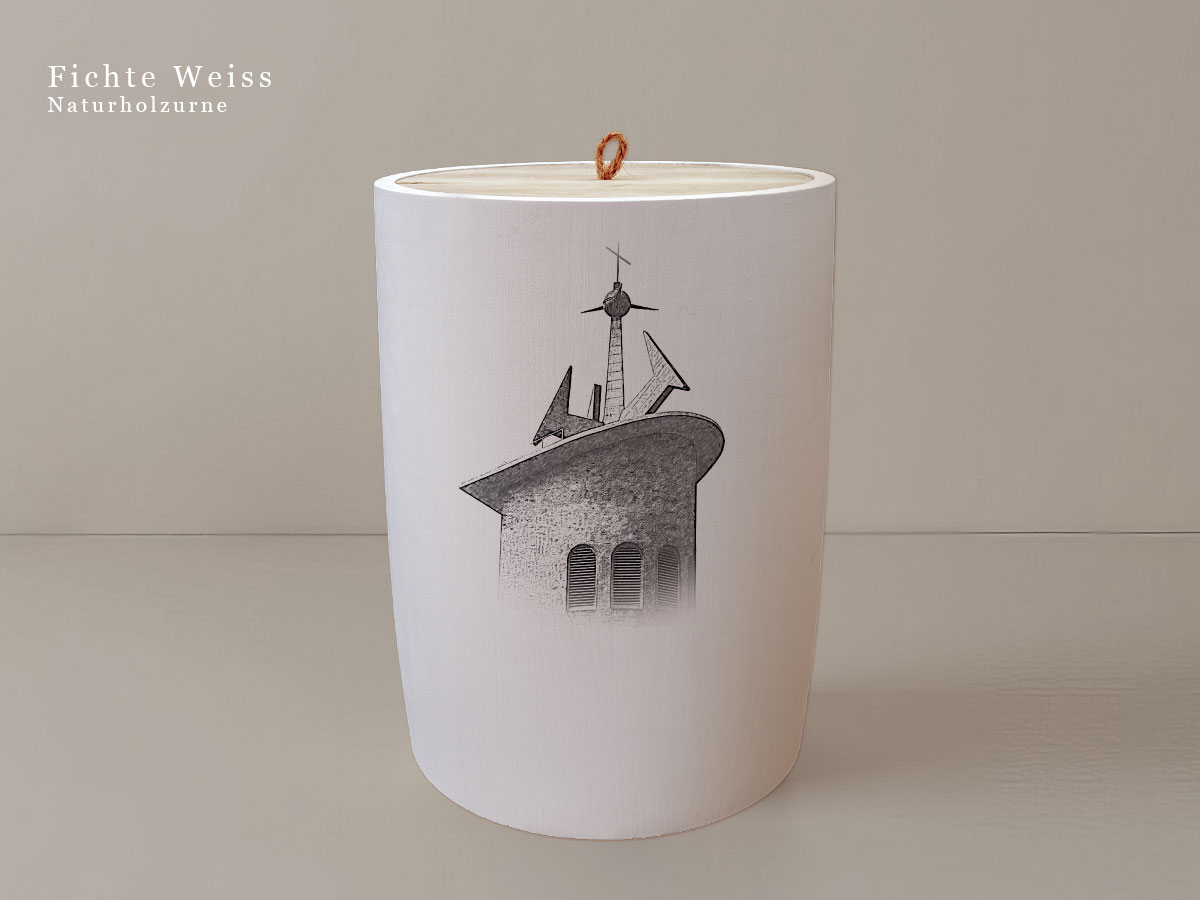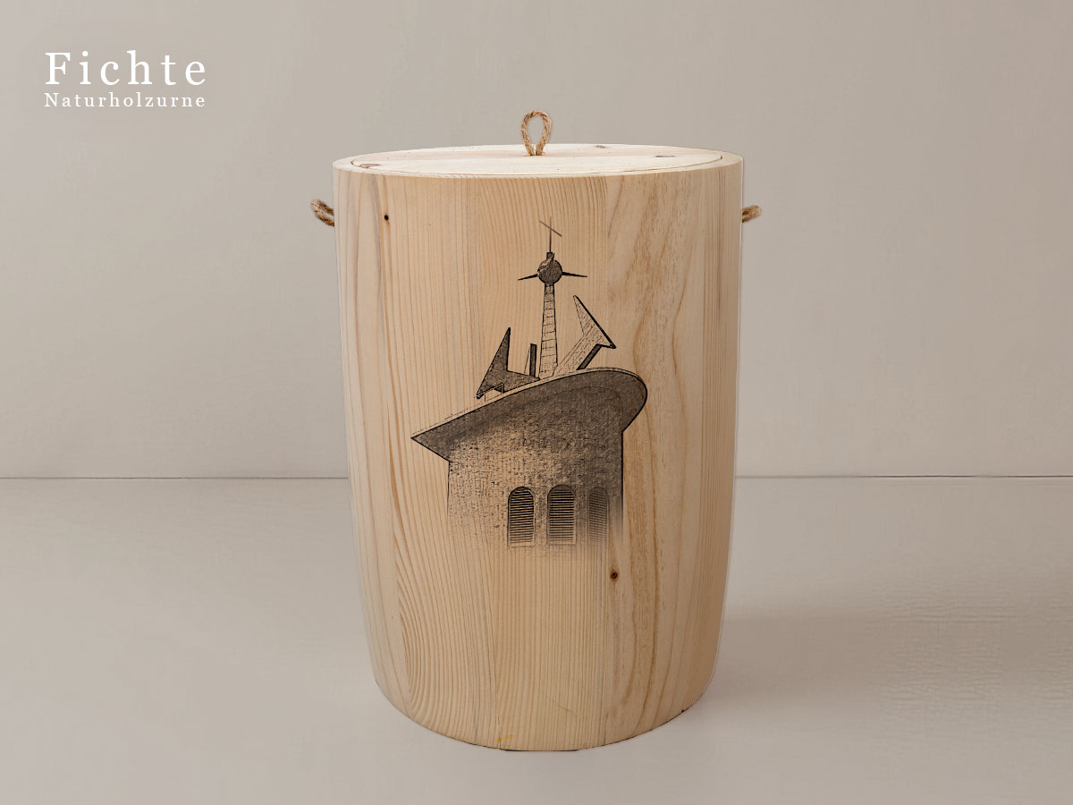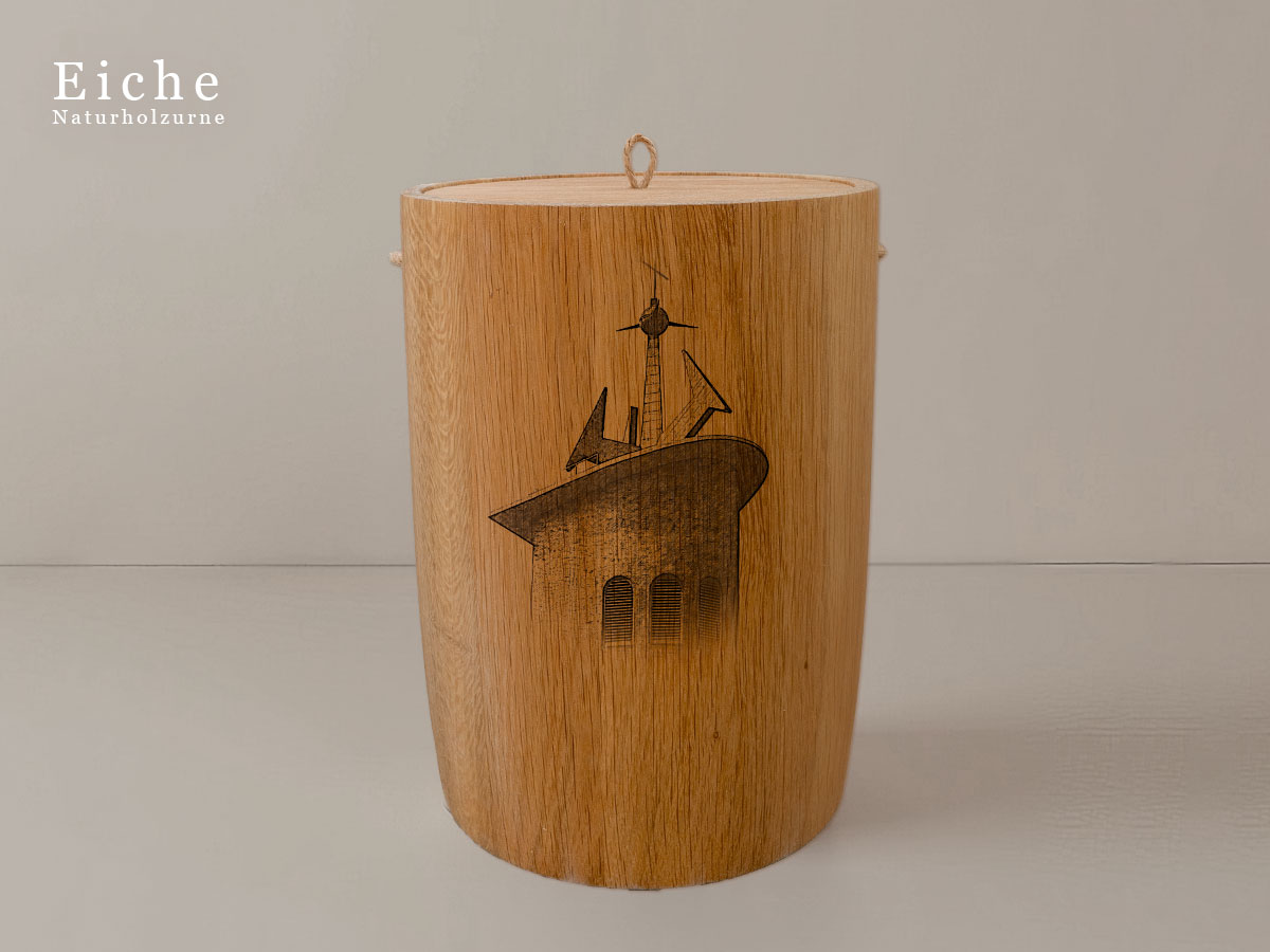 Das Motiv wird präzise in die Oberfläche der Urne gelasert, ohne Verwendung von Farben. So bleibt das natürliche Erscheinungsbild des Holzes erhalten und betont die schlichte Eleganz des Designs.