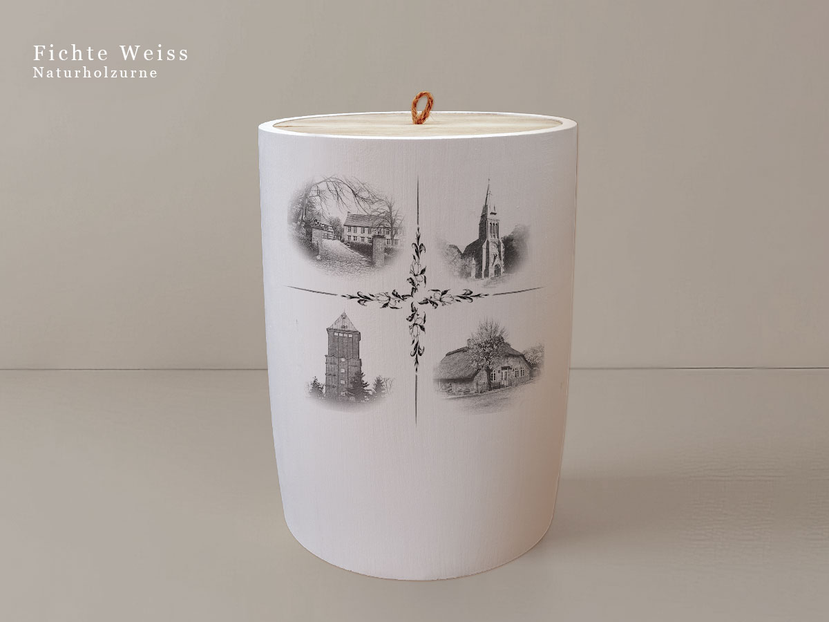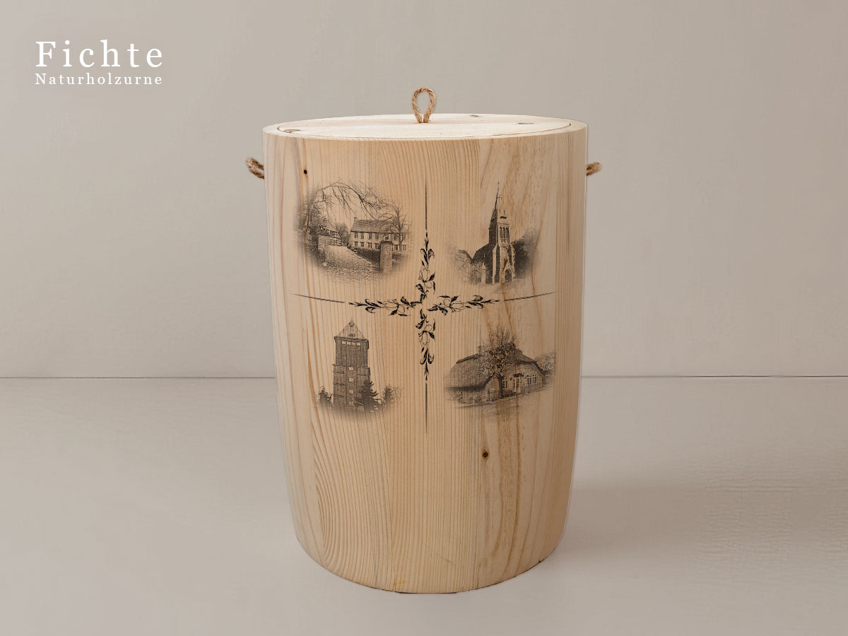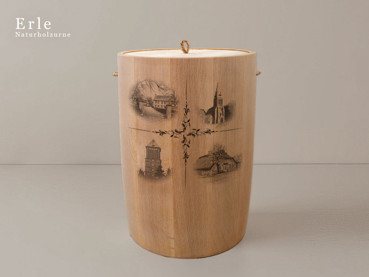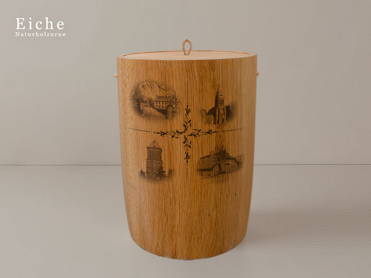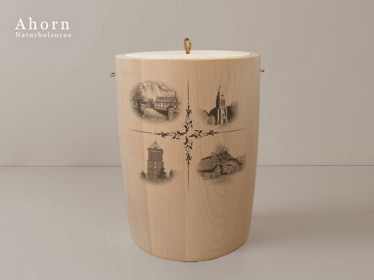 Das Motiv wird präzise in die Oberfläche der Urne gelasert, ohne Verwendung von Farben. So bleibt das natürliche Erscheinungsbild des Holzes erhalten und betont die schlichte Eleganz des Designs.