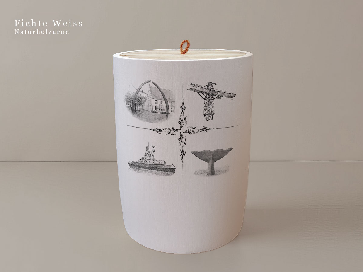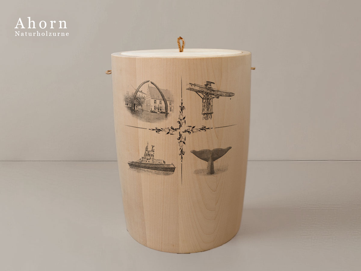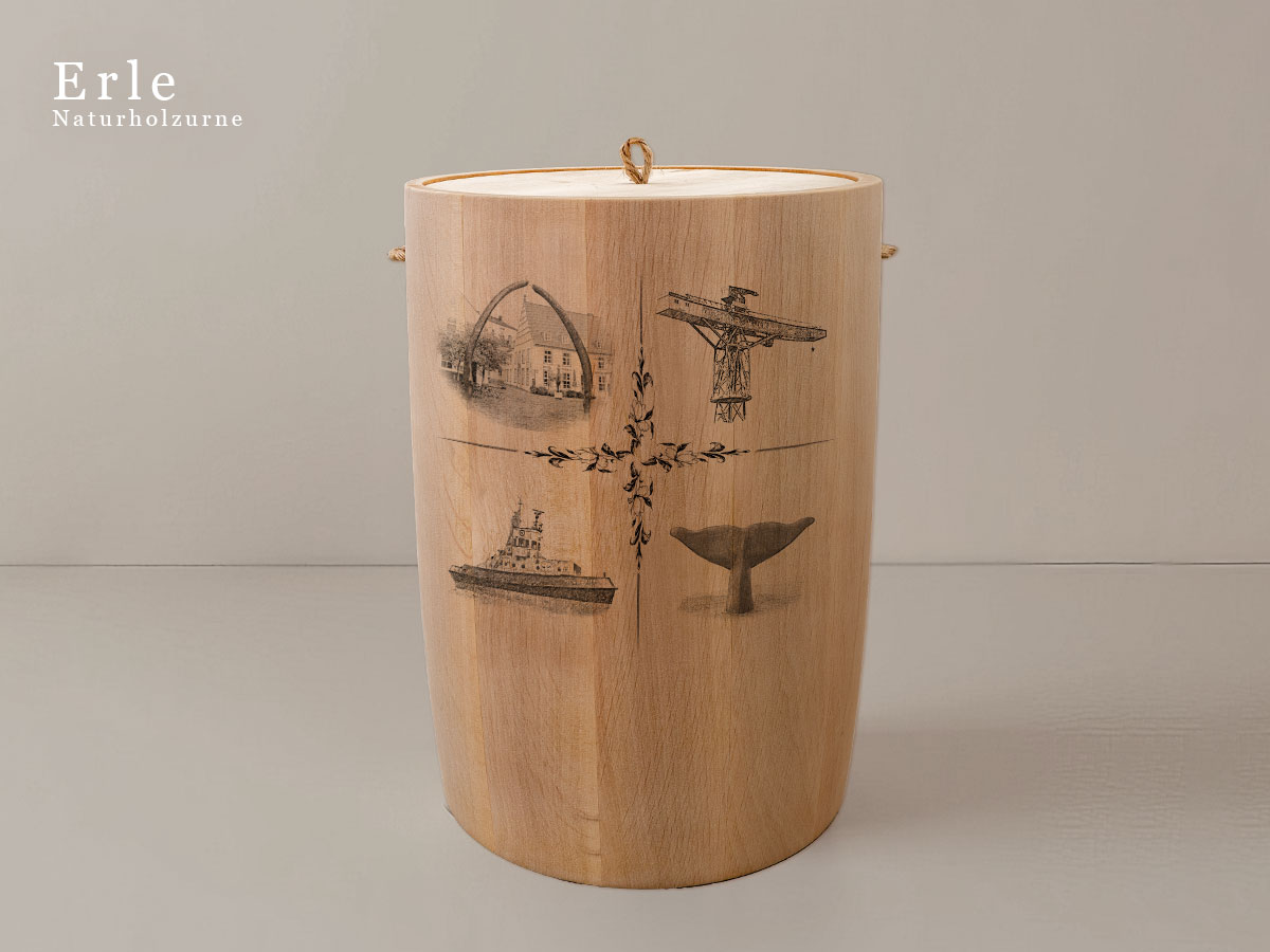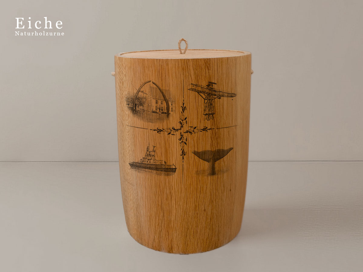 Das Motiv wird präzise in die Oberfläche der Urne gelasert, ohne Verwendung von Farben. So bleibt das natürliche Erscheinungsbild des Holzes erhalten und betont die schlichte Eleganz des Designs.