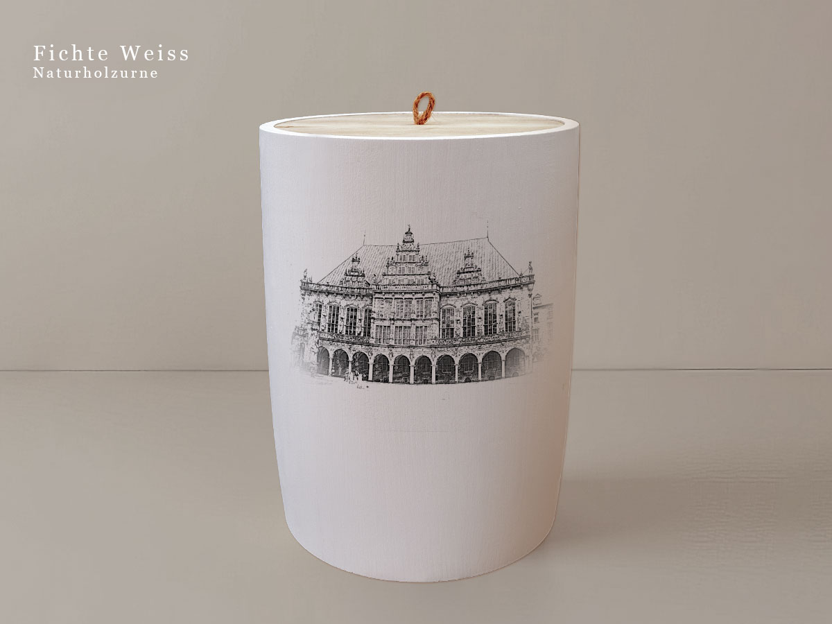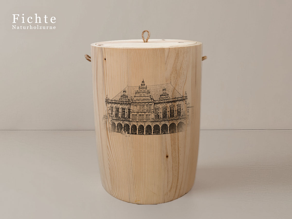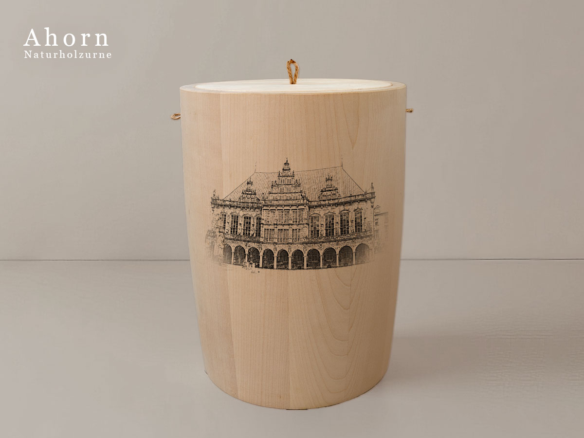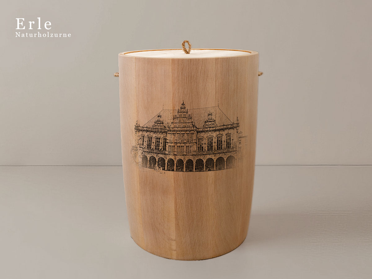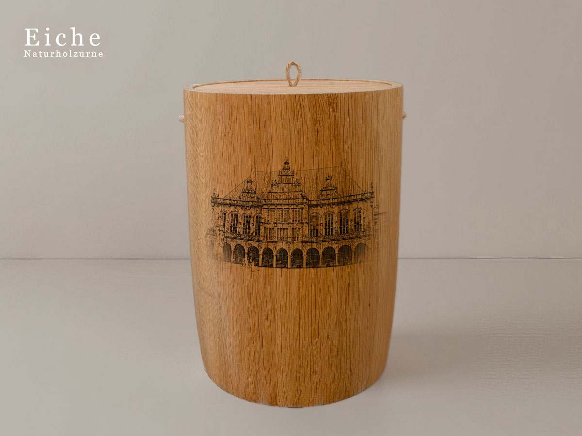 Das Motiv wird präzise in die Oberfläche der Urne gelasert, ohne Verwendung von Farben. So bleibt das natürliche Erscheinungsbild des Holzes erhalten und betont die schlichte Eleganz des Designs.