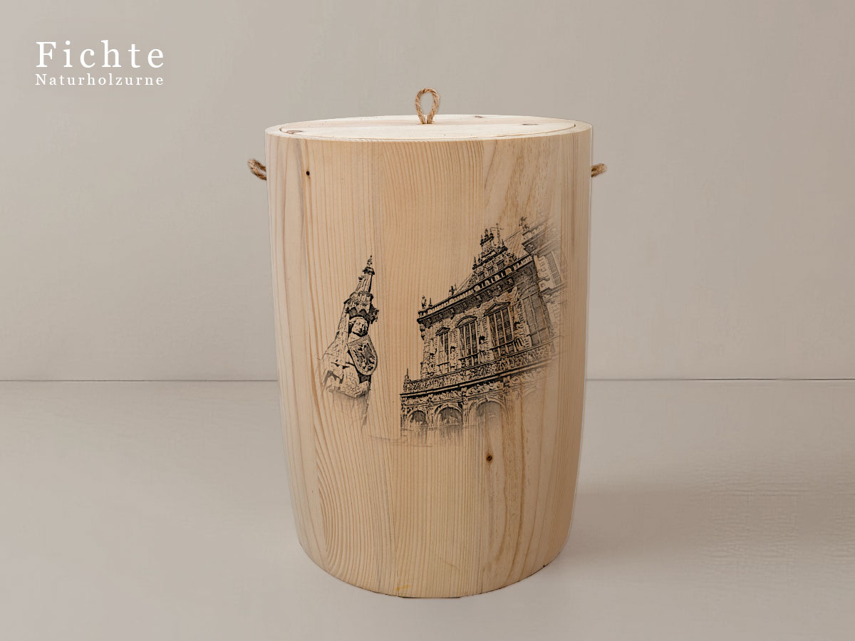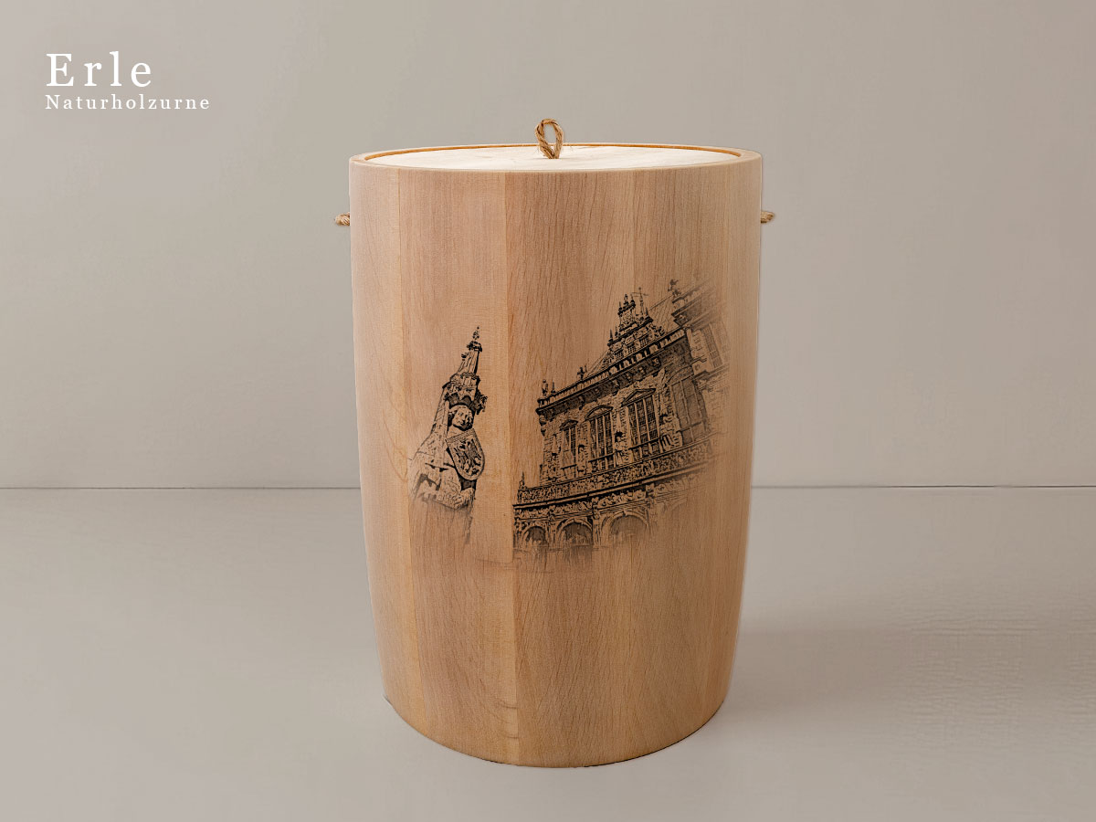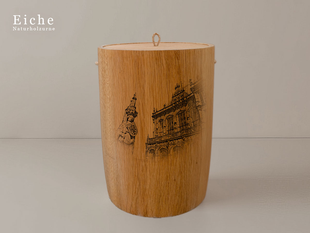 Das Motiv wird präzise in die Oberfläche der Urne gelasert, ohne Verwendung von Farben. So bleibt das natürliche Erscheinungsbild des Holzes erhalten und betont die schlichte Eleganz des Designs.