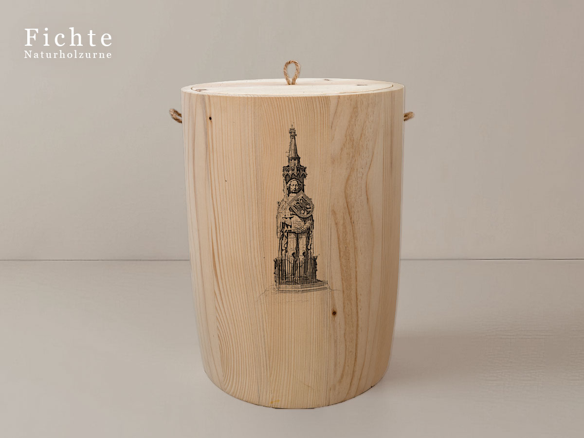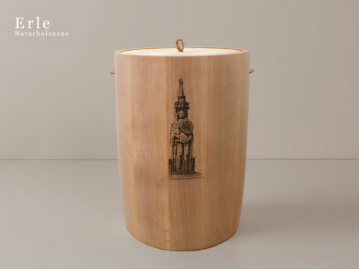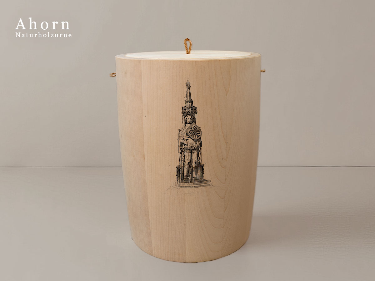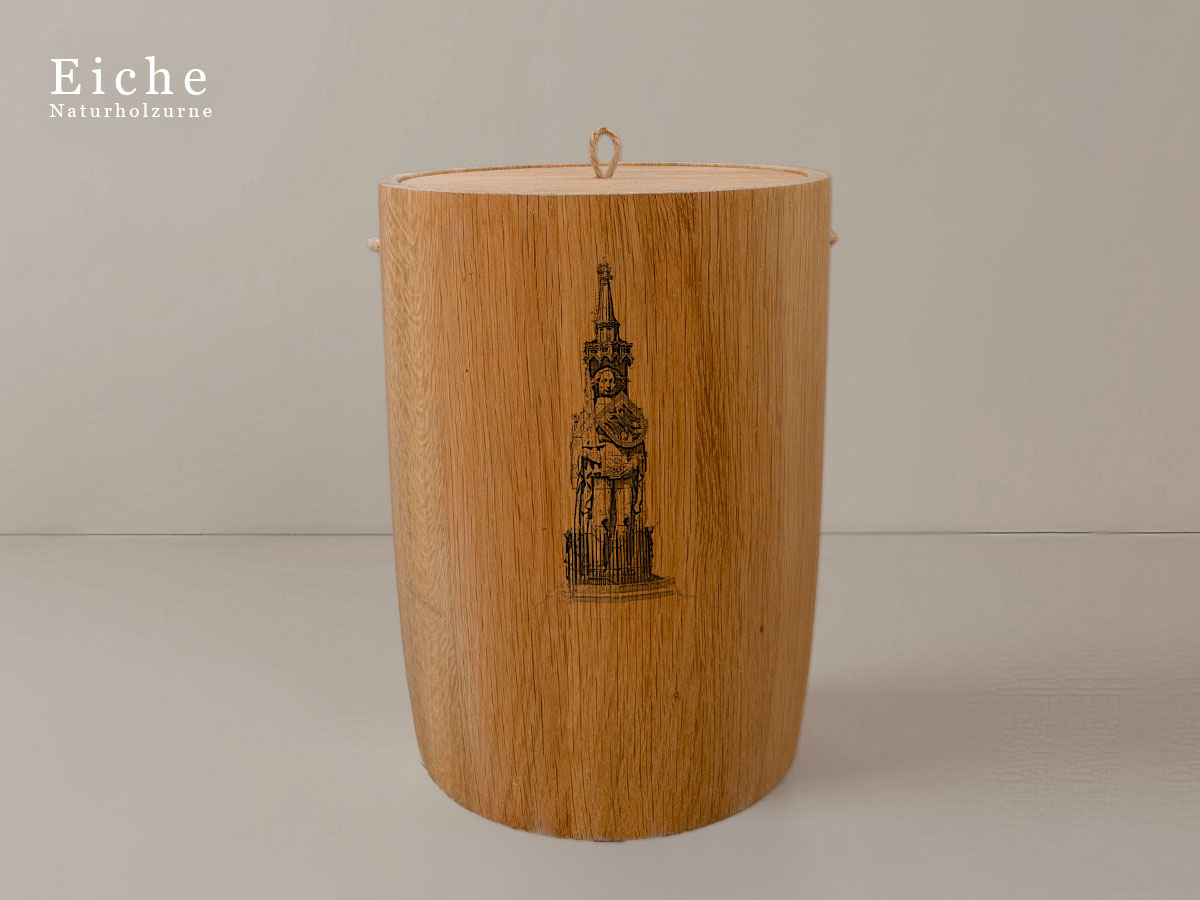 Das Motiv wird präzise in die Oberfläche der Urne gelasert, ohne Verwendung von Farben. So bleibt das natürliche Erscheinungsbild des Holzes erhalten und betont die schlichte Eleganz des Designs.