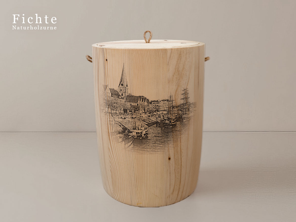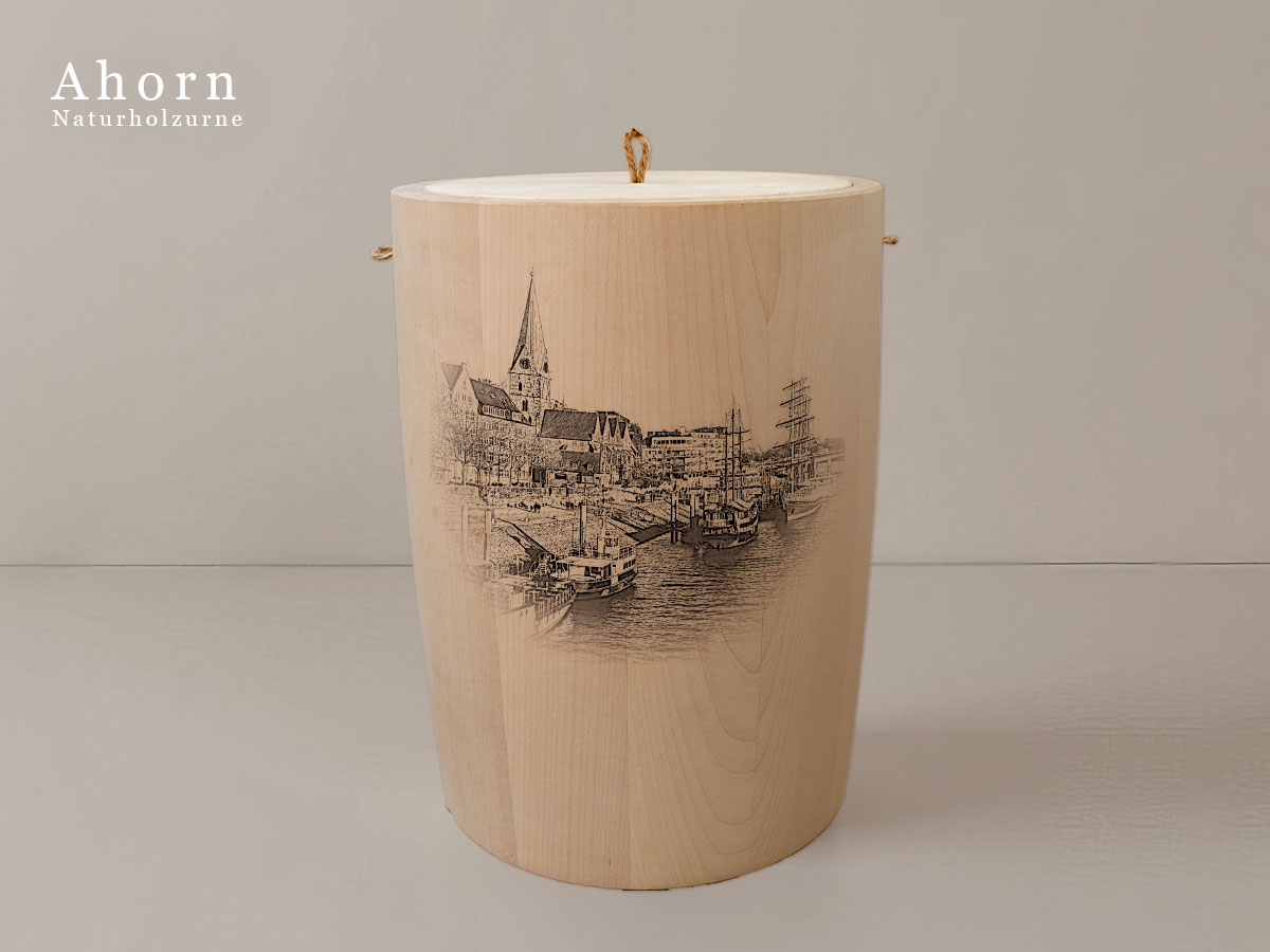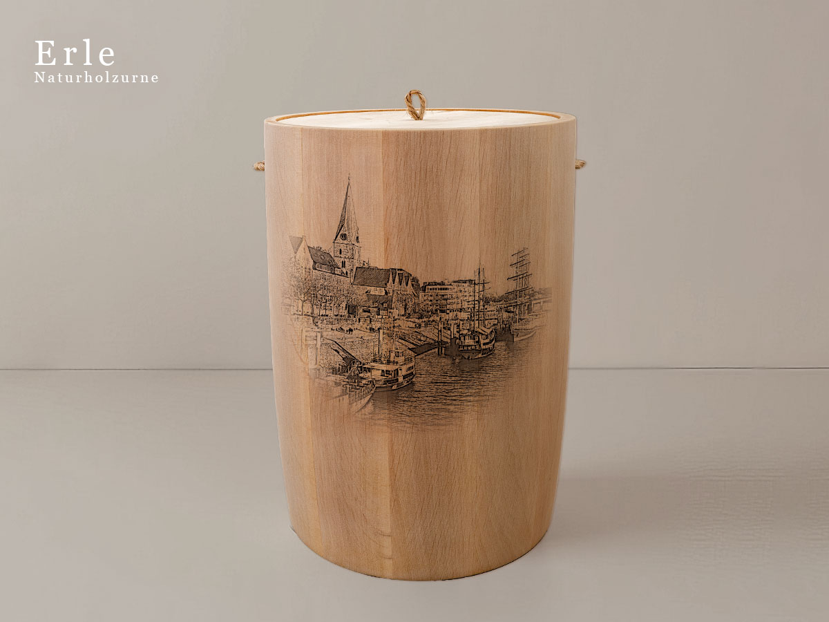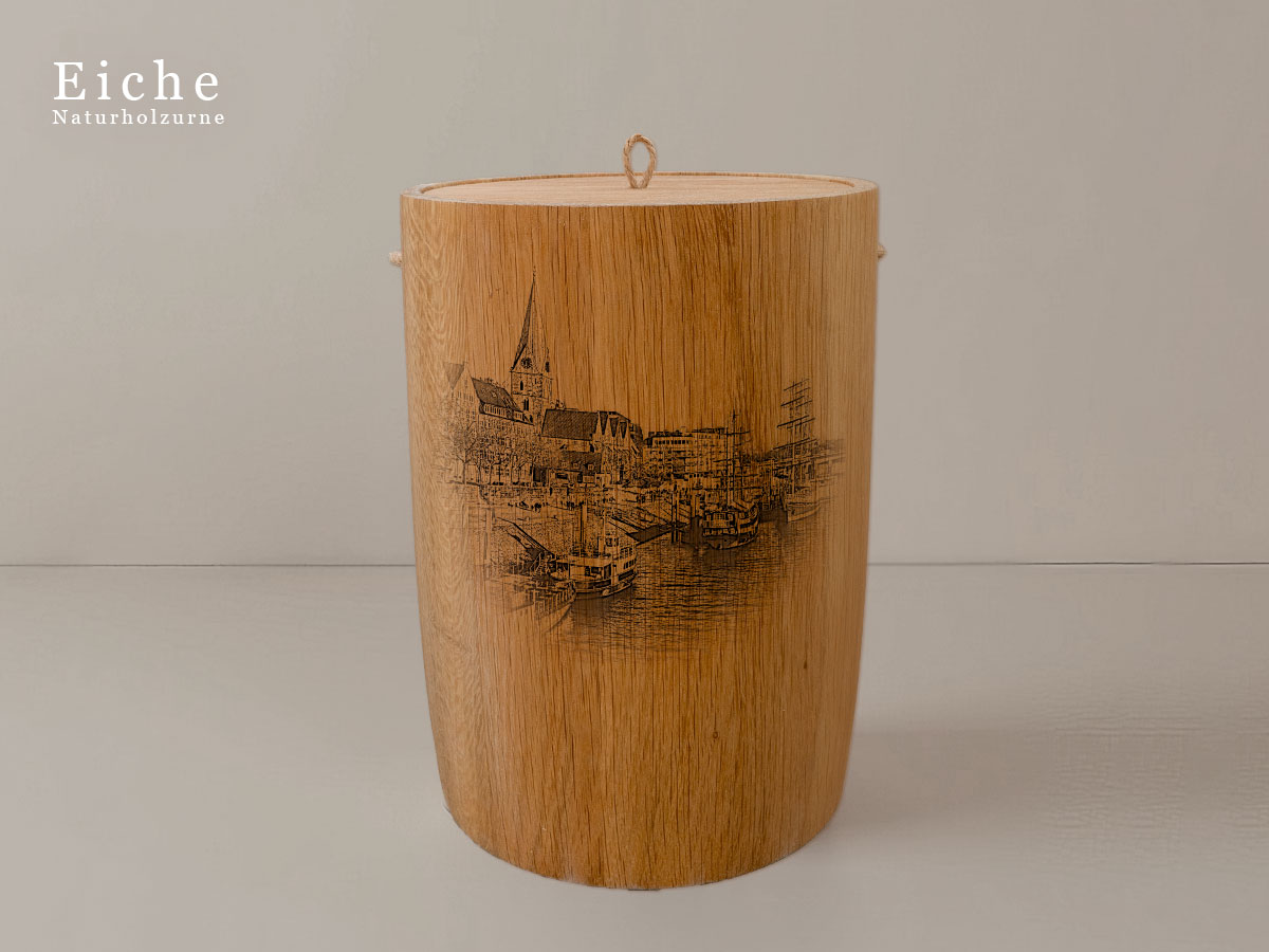 Das Motiv wird präzise in die Oberfläche der Urne gelasert, ohne Verwendung von Farben. So bleibt das natürliche Erscheinungsbild des Holzes erhalten und betont die schlichte Eleganz des Designs.