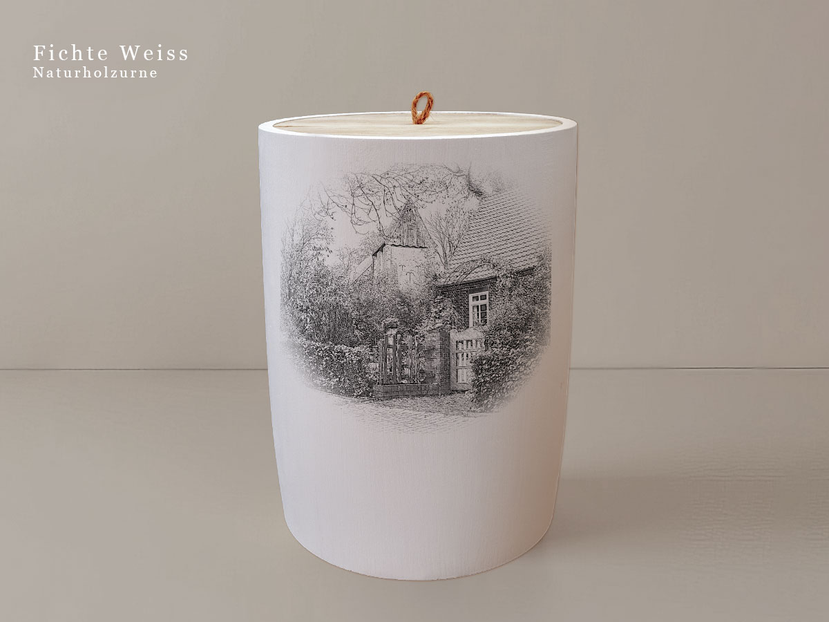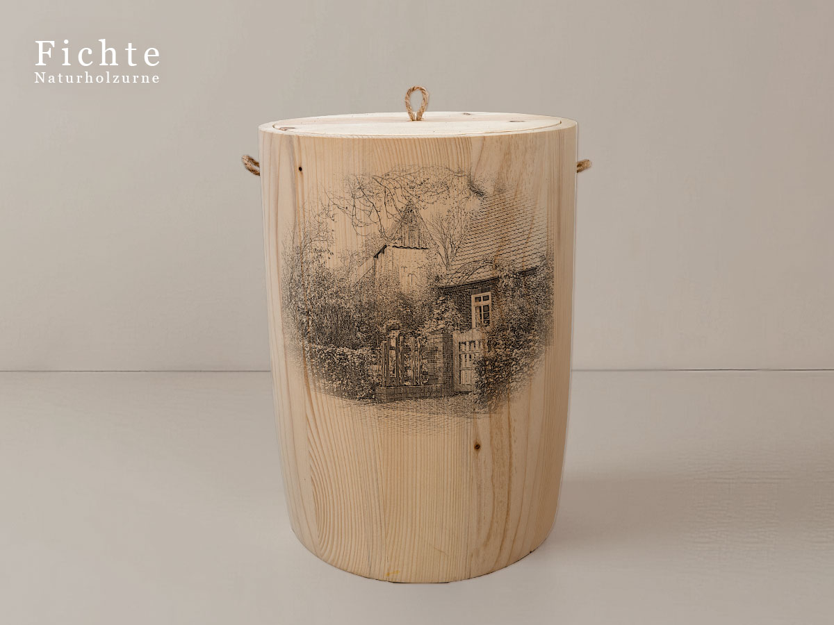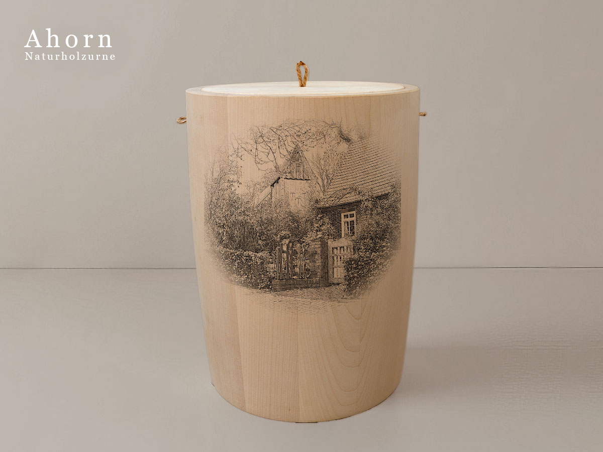 Das Motiv wird präzise in die Oberfläche der Urne gelasert, ohne Verwendung von Farben. So bleibt das natürliche Erscheinungsbild des Holzes erhalten und betont die schlichte Eleganz des Designs.