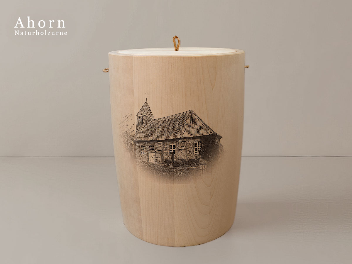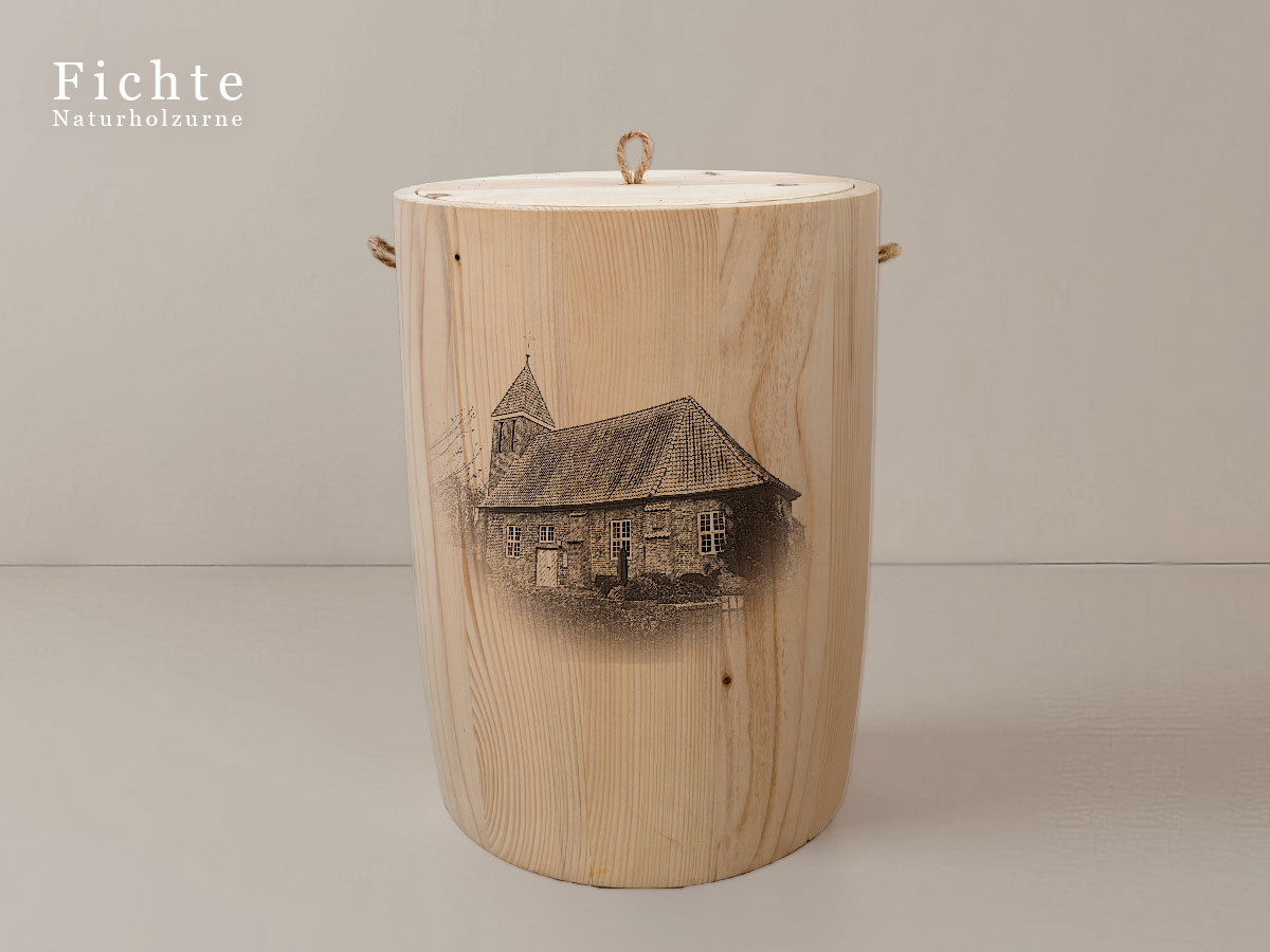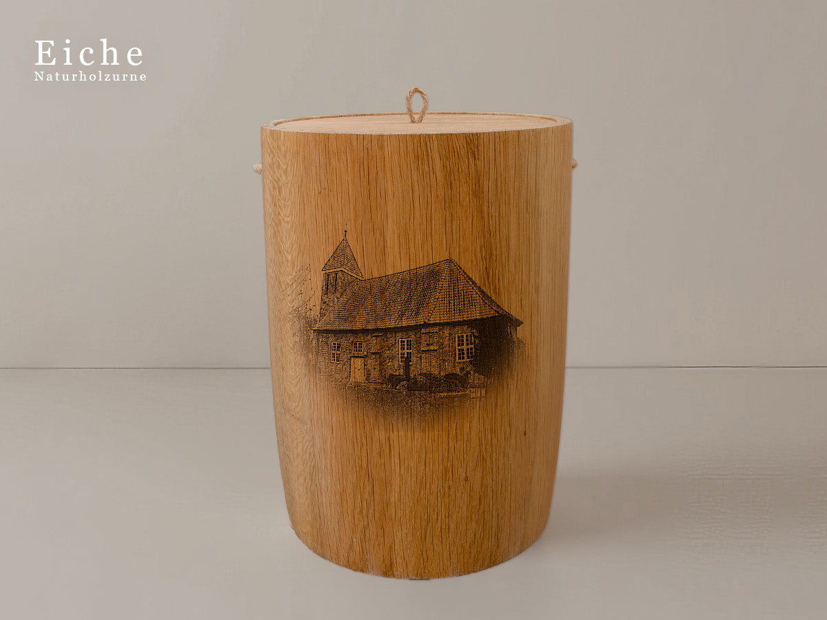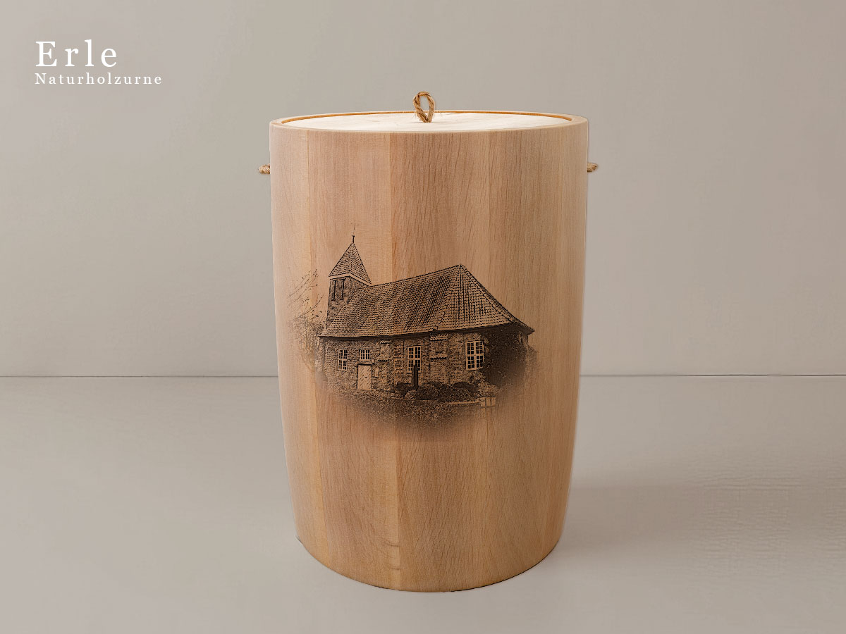Das Motiv wird präzise in die Oberfläche der Urne gelasert, ohne Verwendung von Farben. So bleibt das natürliche Erscheinungsbild des Holzes erhalten und betont die schlichte Eleganz des Designs.
