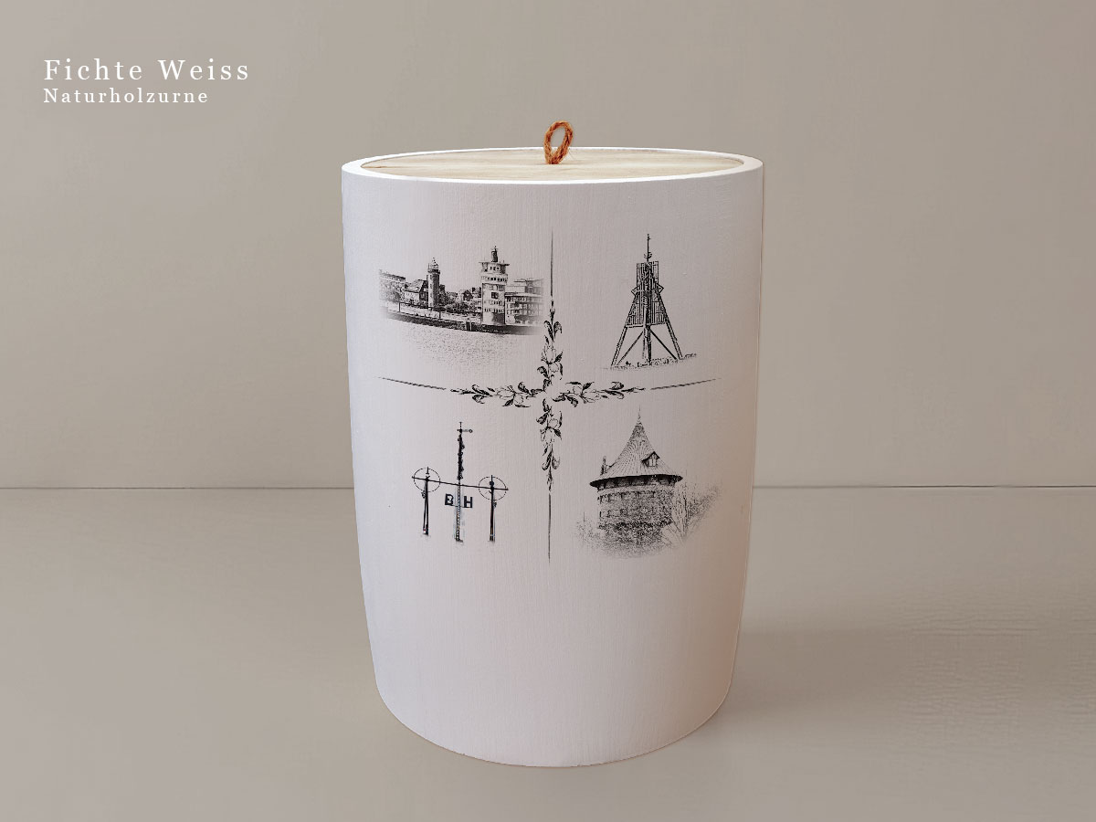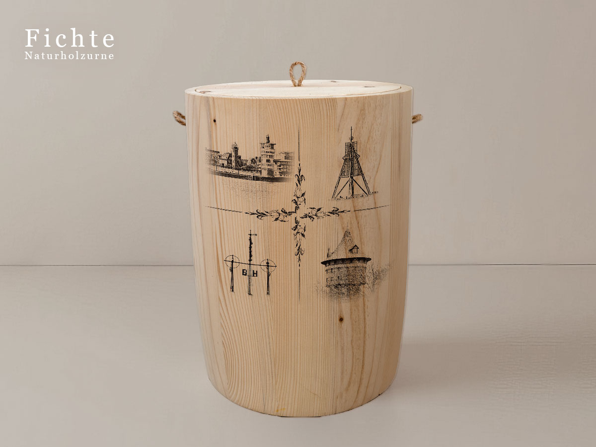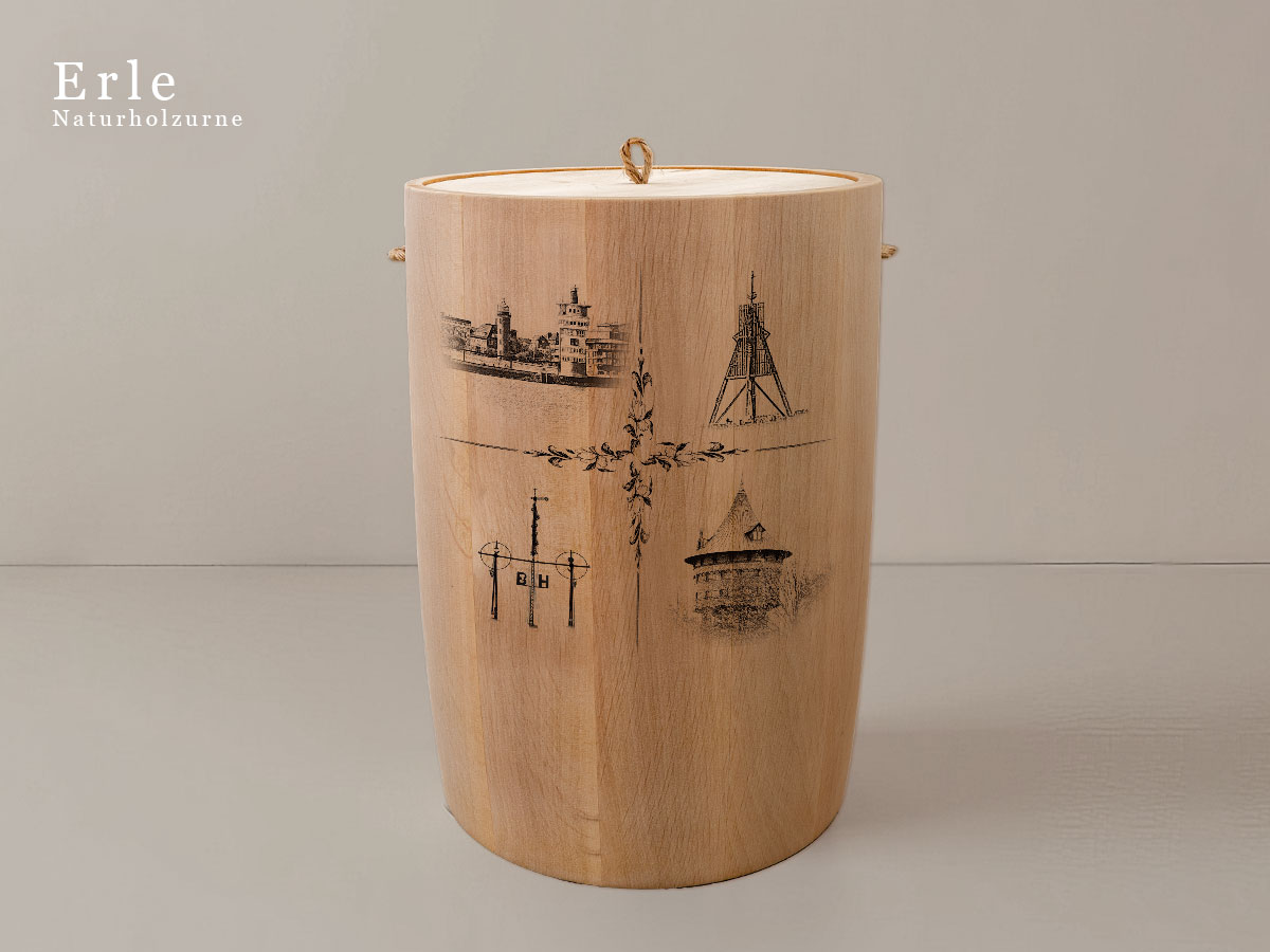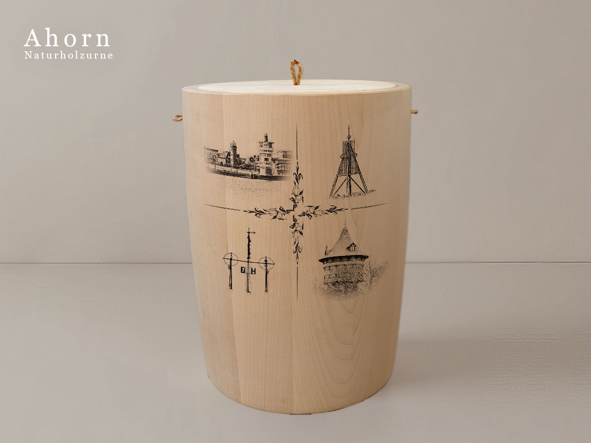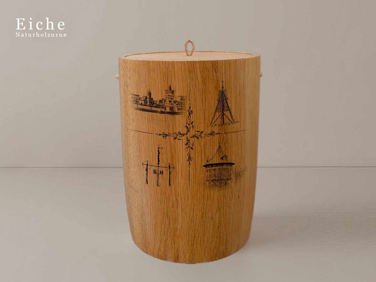 Das Motiv wird präzise in die Oberfläche der Urne gelasert, ohne Verwendung von Farben. So bleibt das natürliche Erscheinungsbild des Holzes erhalten und betont die schlichte Eleganz des Designs.