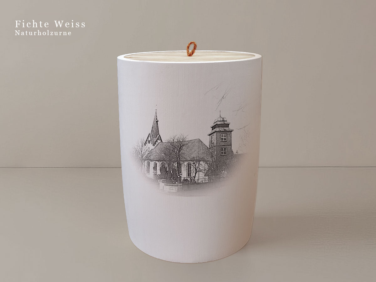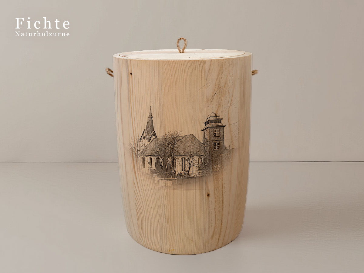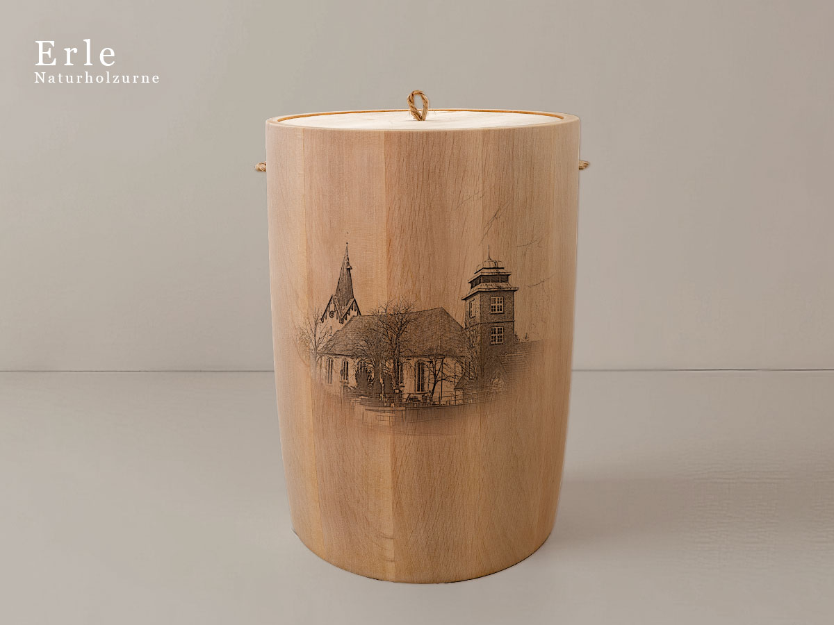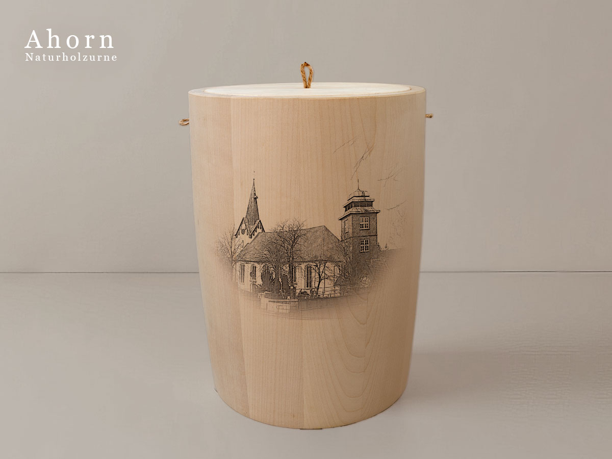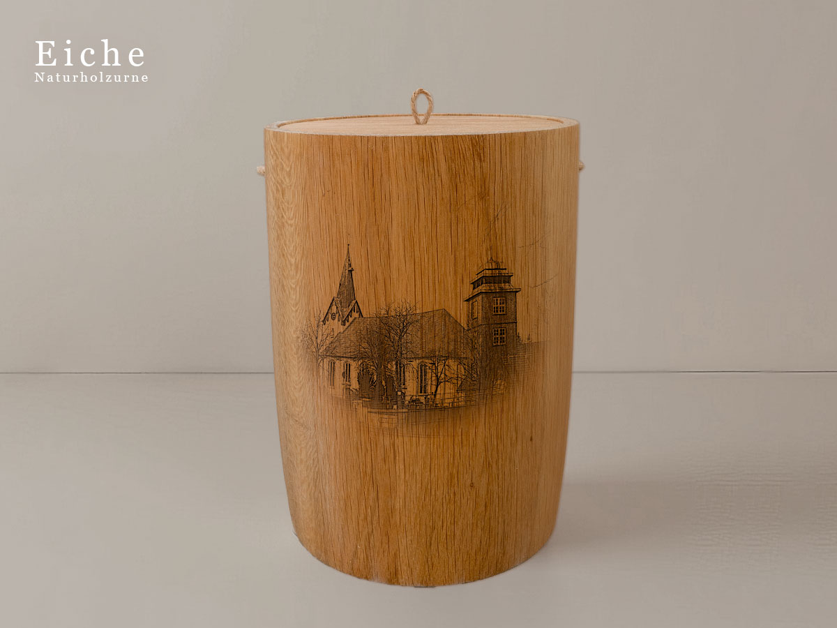 Das Motiv wird präzise in die Oberfläche der Urne gelasert, ohne Verwendung von Farben. So bleibt das natürliche Erscheinungsbild des Holzes erhalten und betont die schlichte Eleganz des Designs.