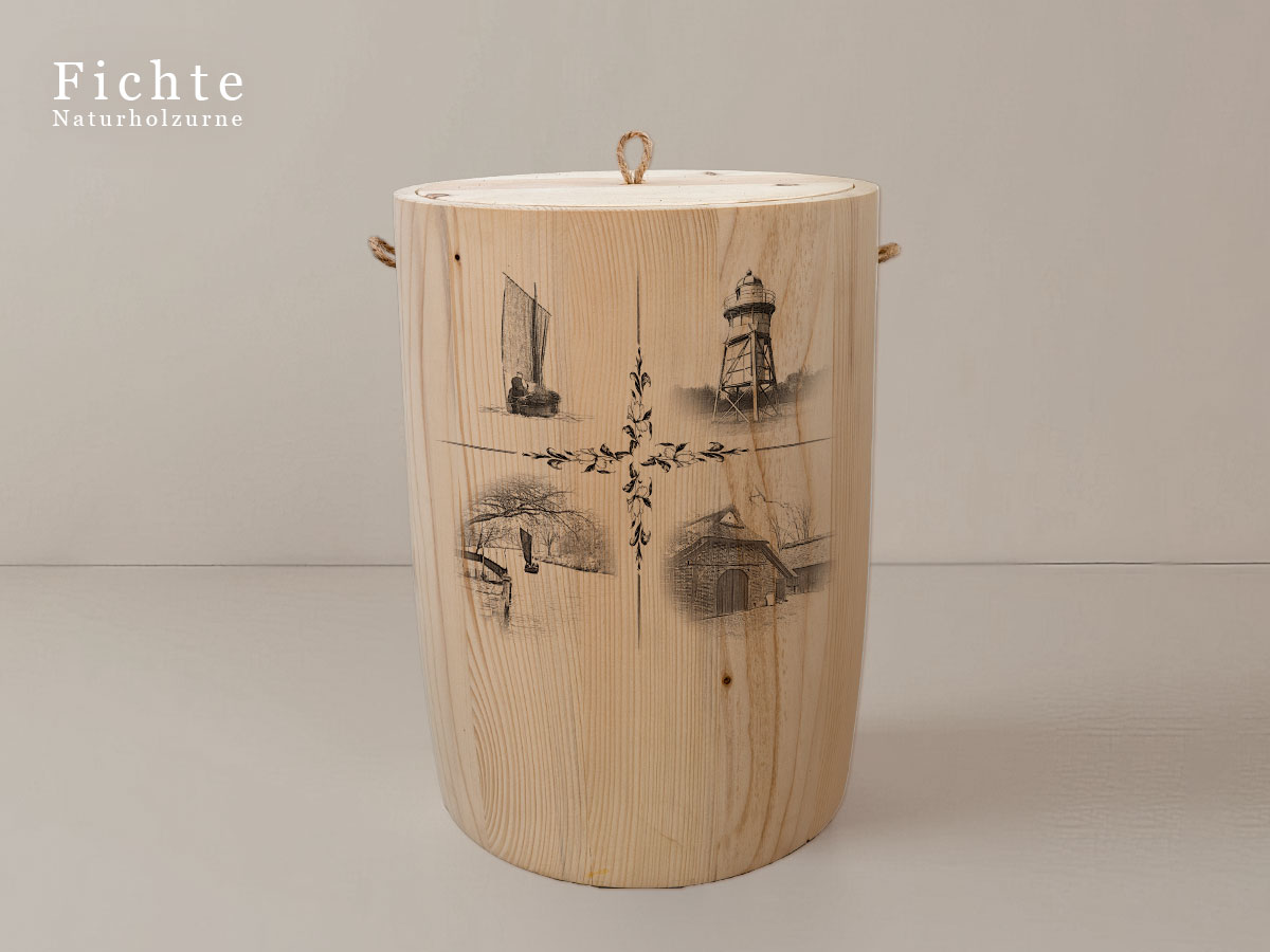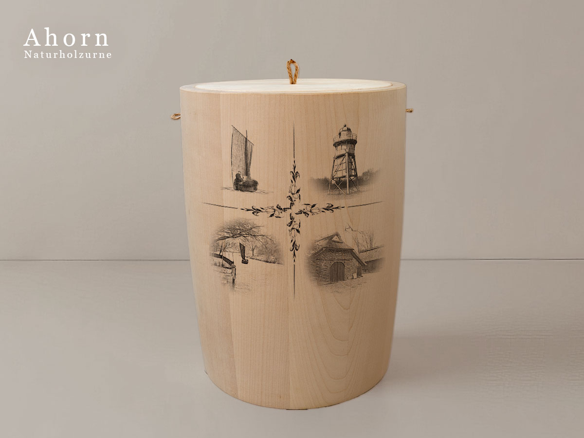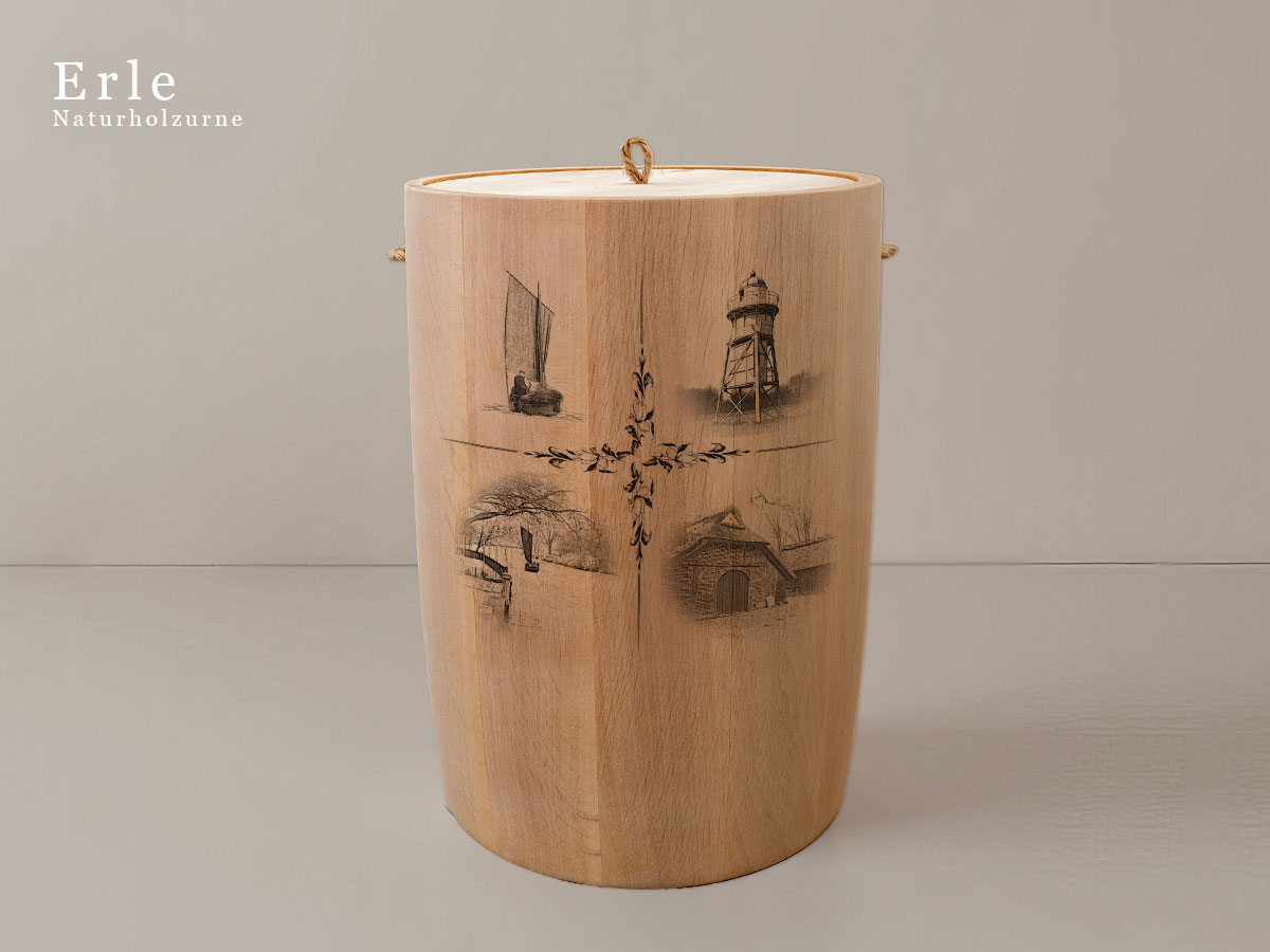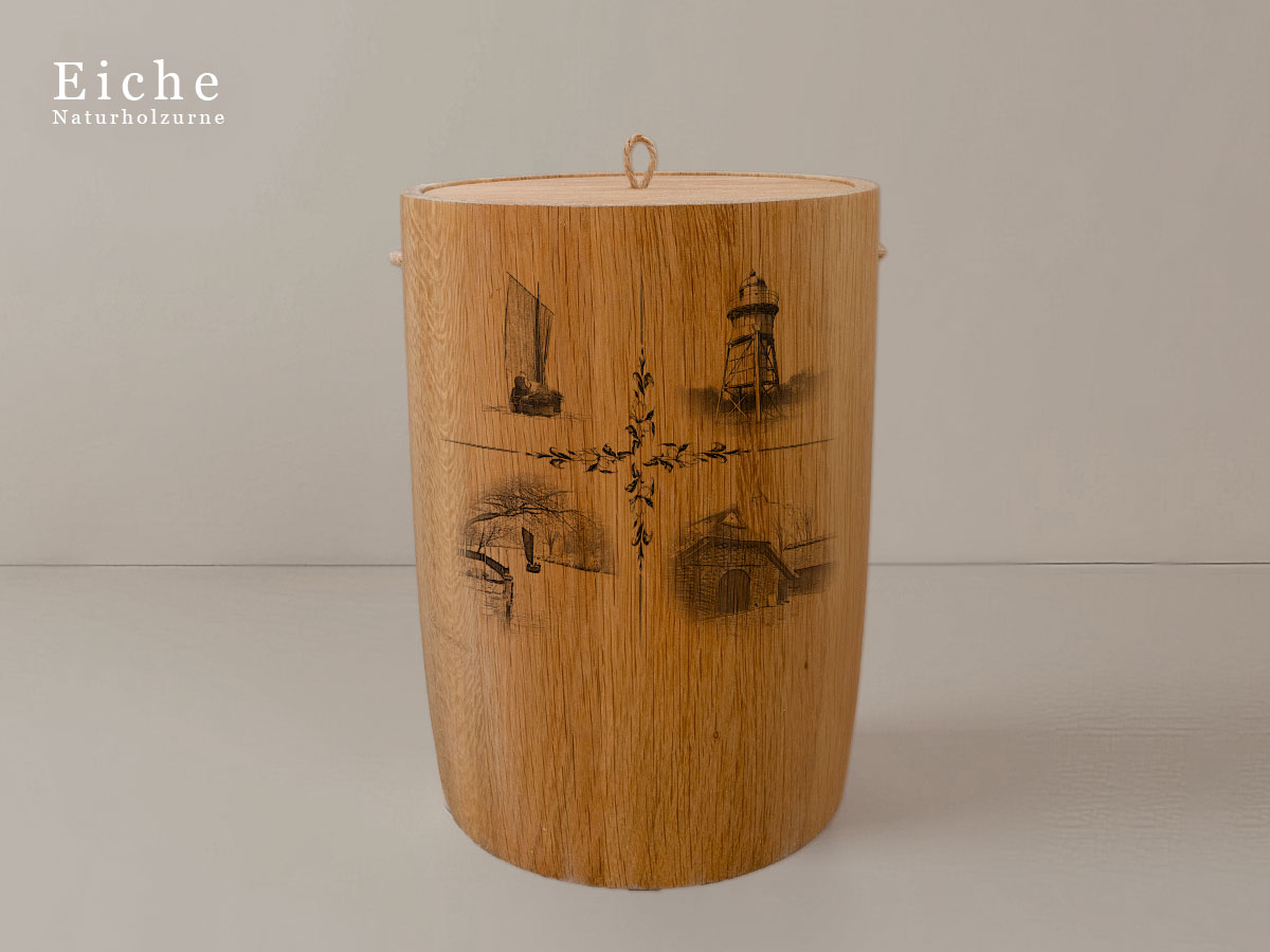 Das Motiv wird präzise in die Oberfläche der Urne gelasert, ohne Verwendung von Farben. So bleibt das natürliche Erscheinungsbild des Holzes erhalten und betont die schlichte Eleganz des Designs.