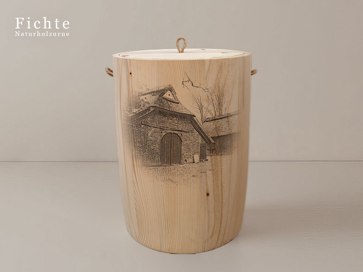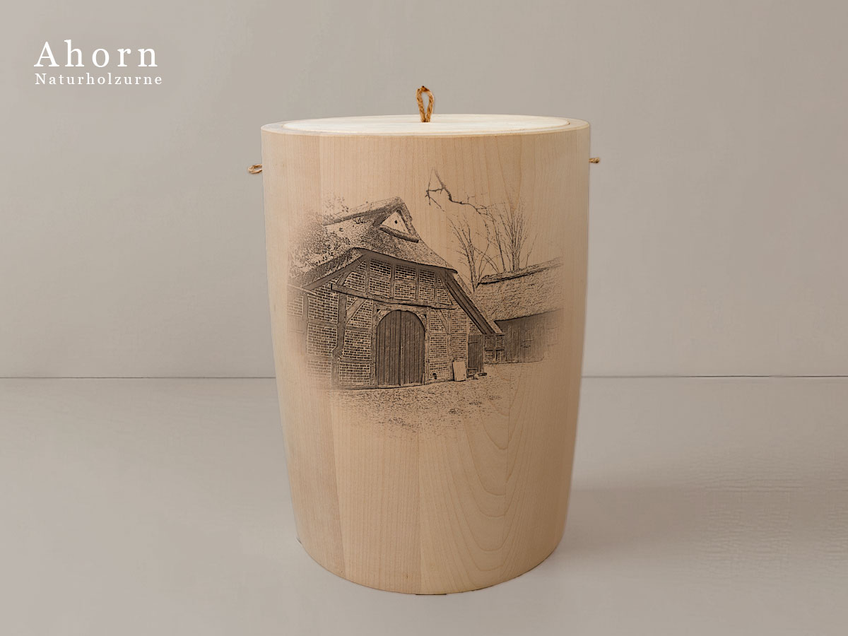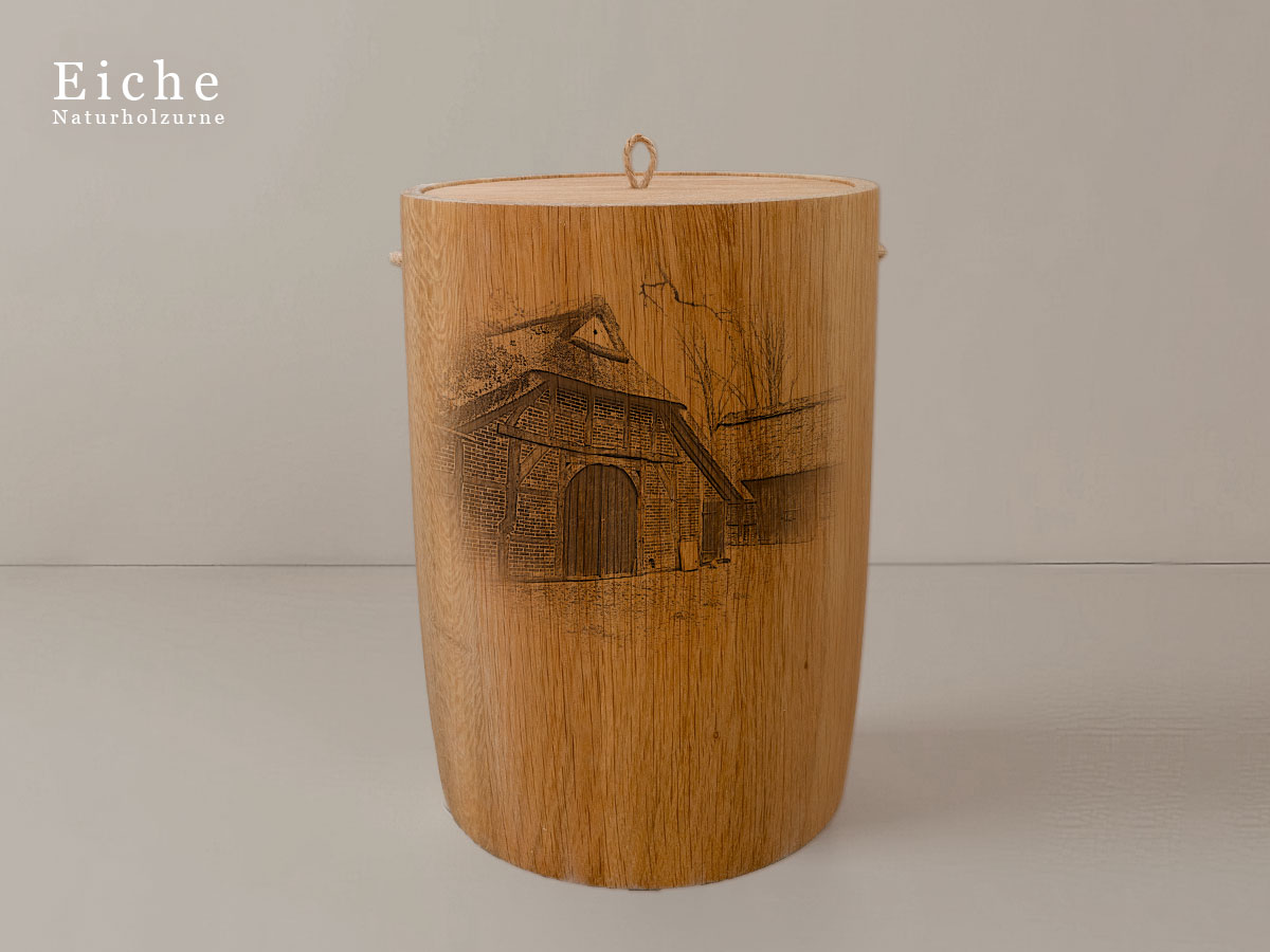 Das Motiv wird präzise in die Oberfläche der Urne gelasert, ohne Verwendung von Farben. So bleibt das natürliche Erscheinungsbild des Holzes erhalten und betont die schlichte Eleganz des Designs.