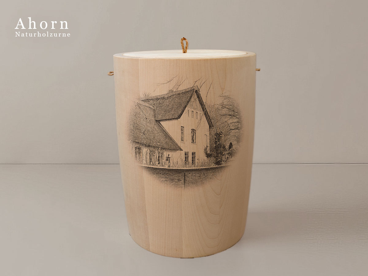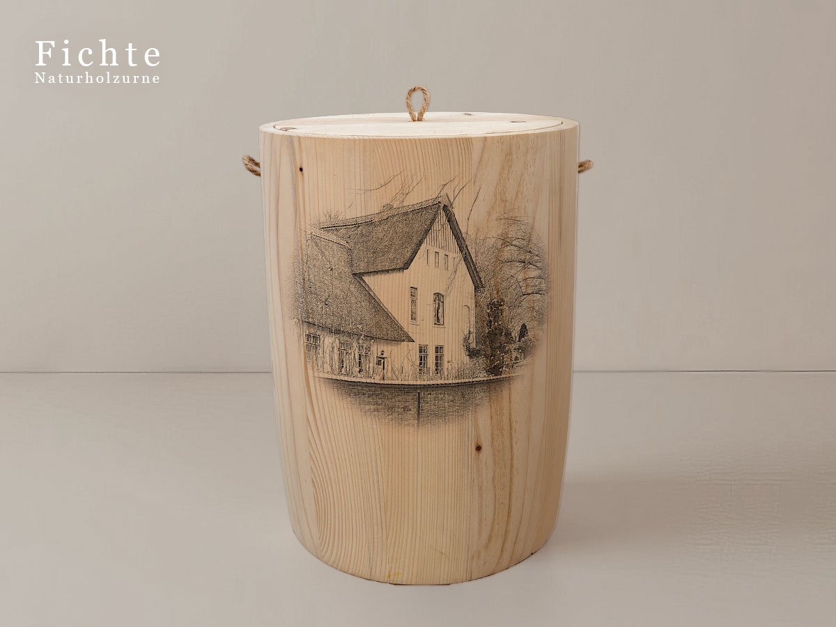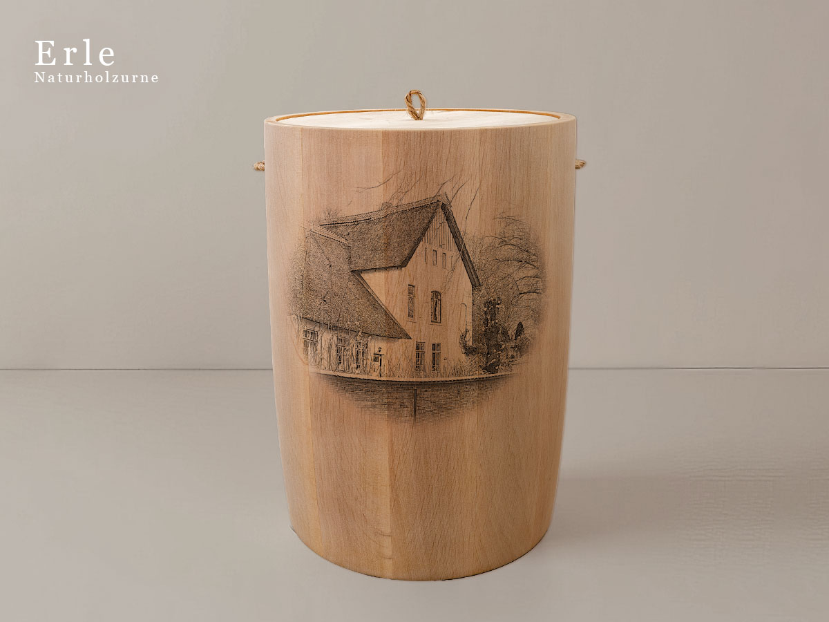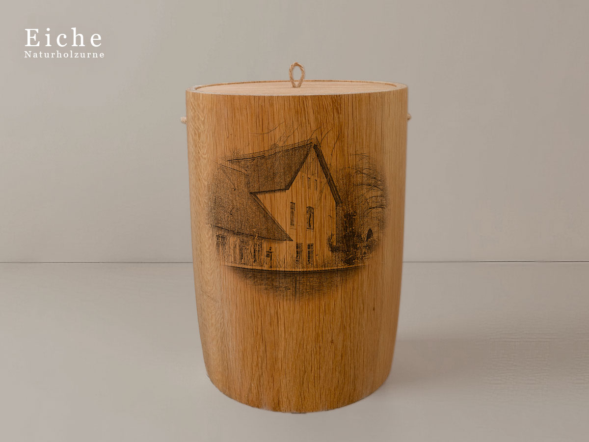 Das Motiv wird präzise in die Oberfläche der Urne gelasert, ohne Verwendung von Farben. So bleibt das natürliche Erscheinungsbild des Holzes erhalten und betont die schlichte Eleganz des Designs.