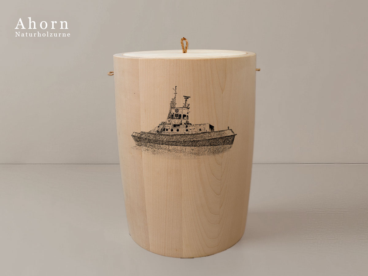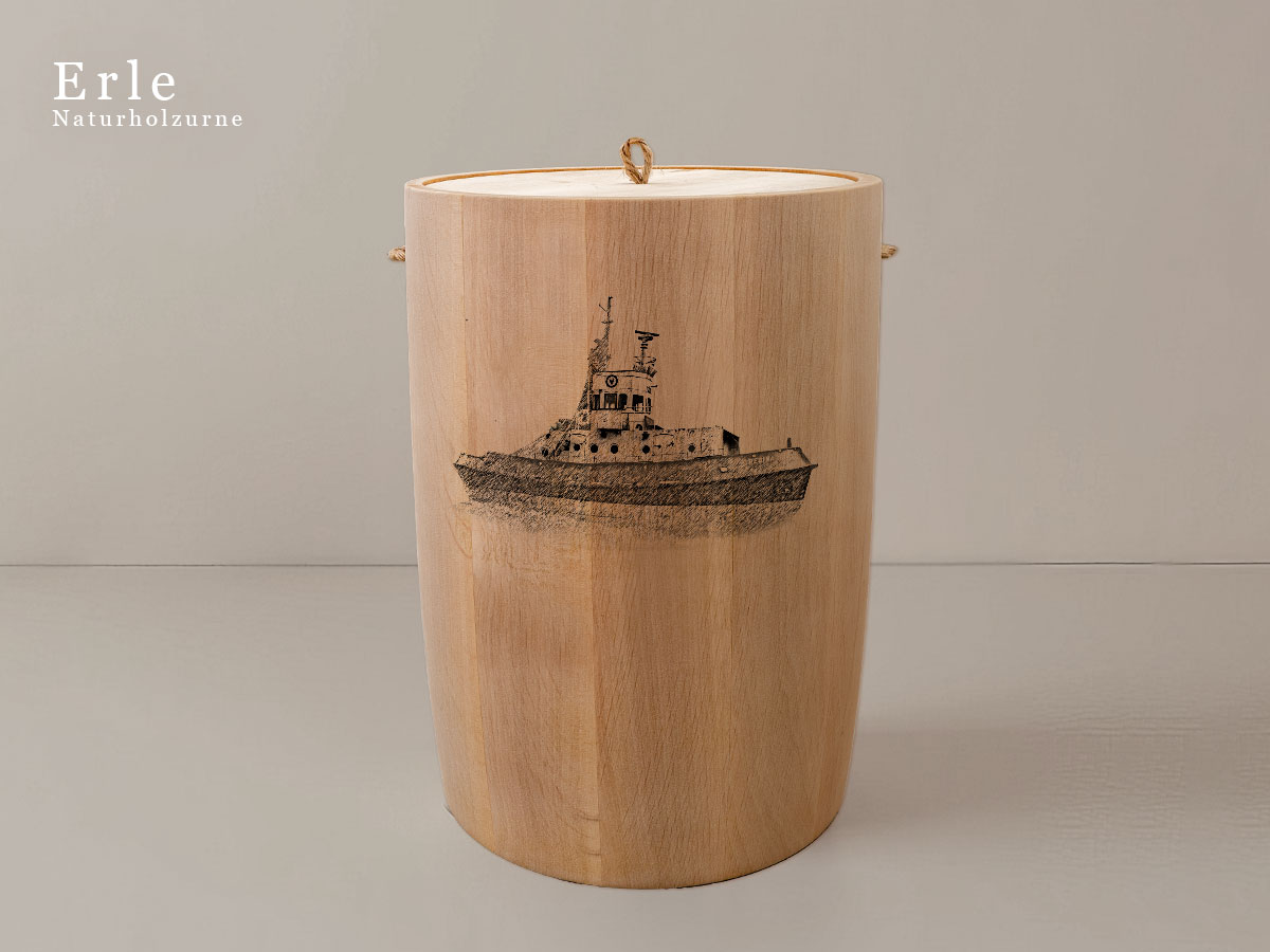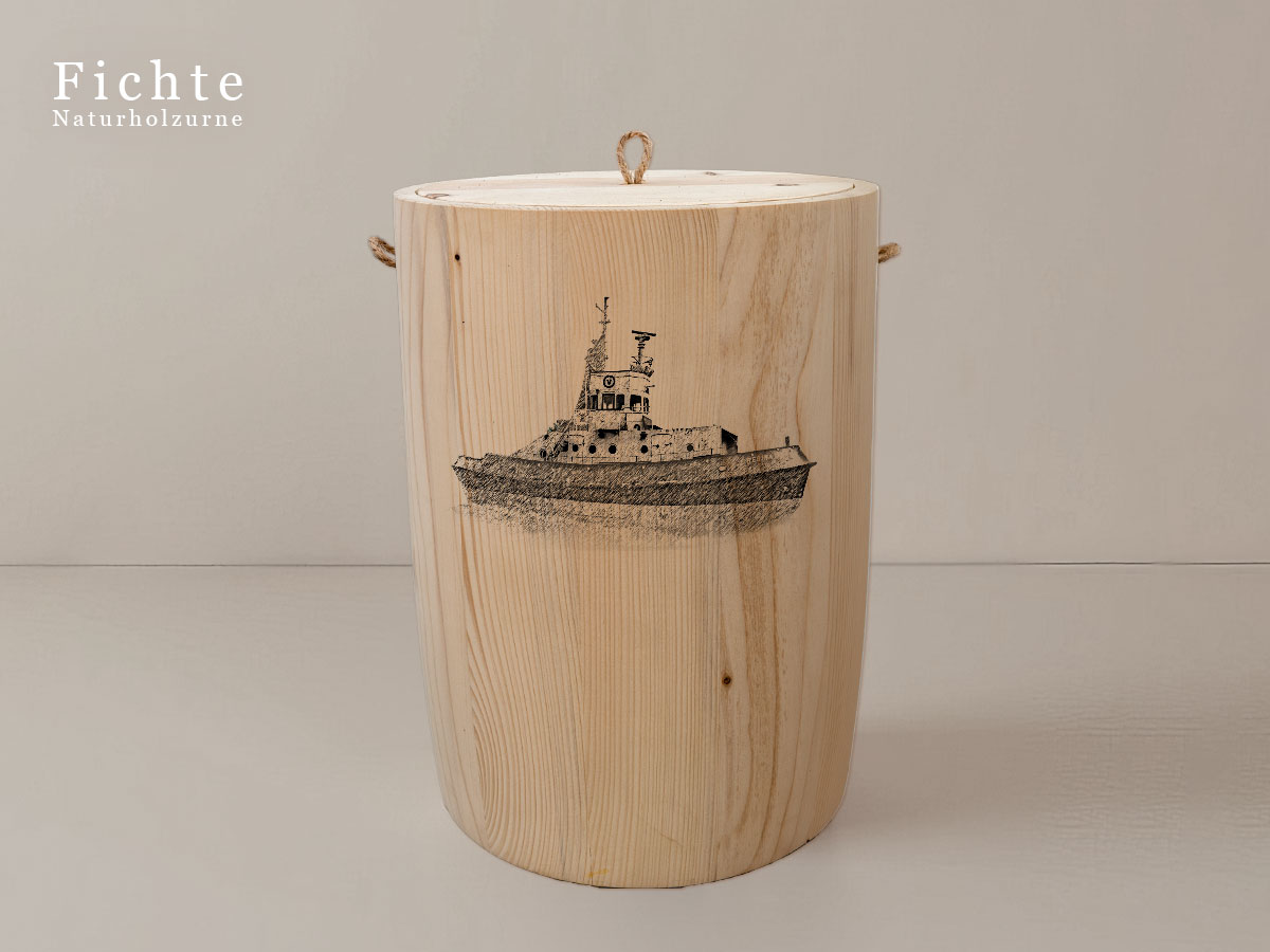 Das Motiv wird präzise in die Oberfläche der Urne gelasert, ohne Verwendung von Farben. So bleibt das natürliche Erscheinungsbild des Holzes erhalten und betont die schlichte Eleganz des Designs.