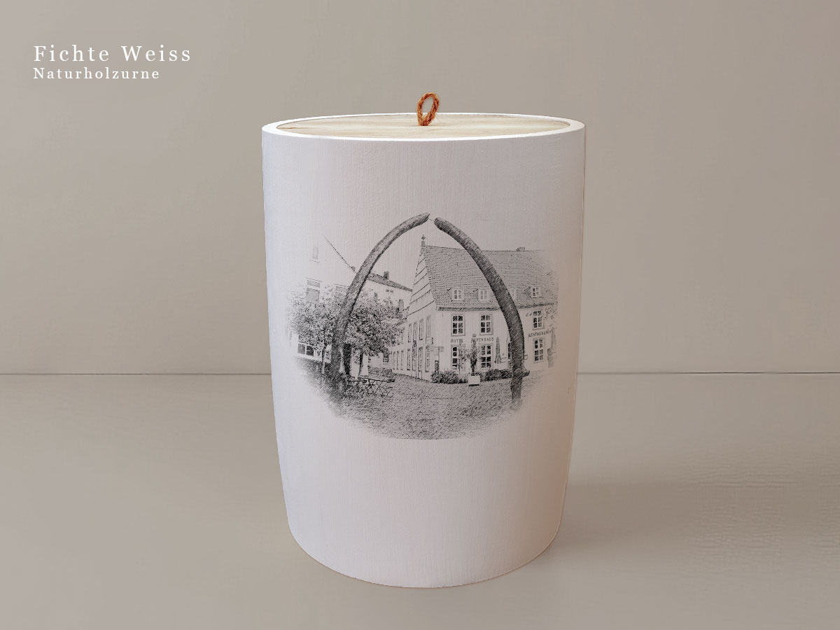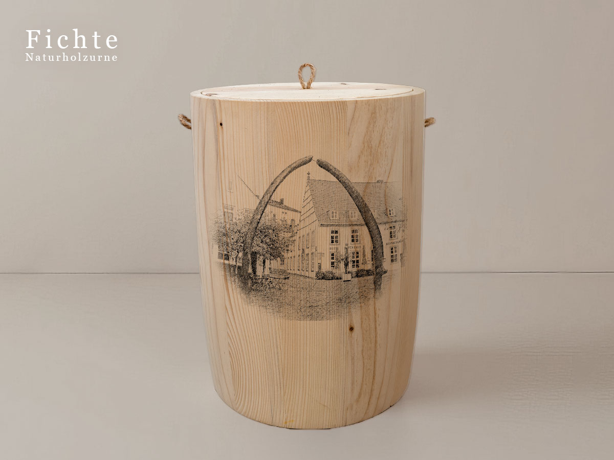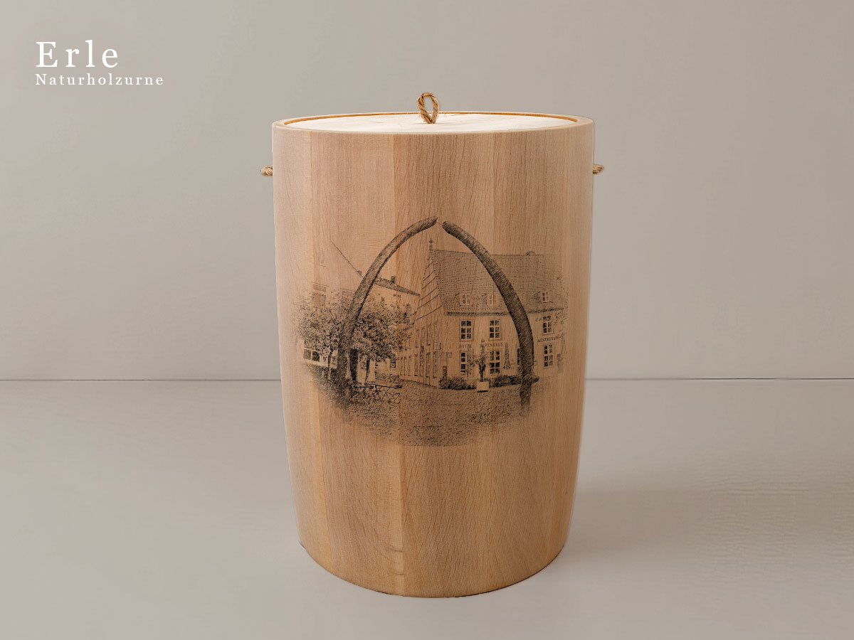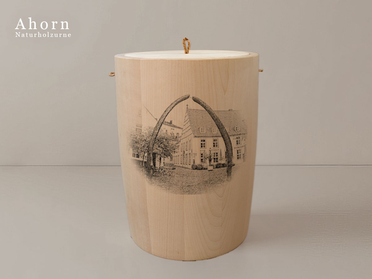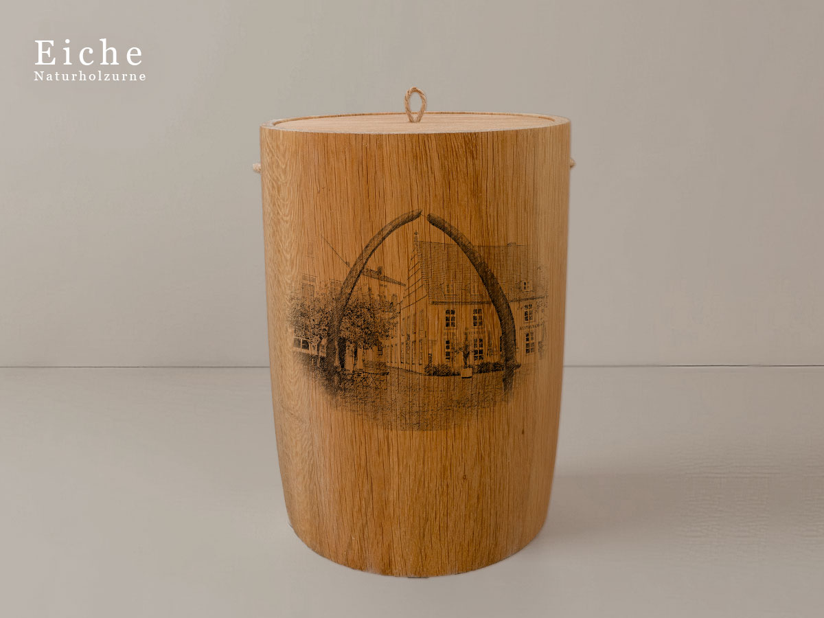 Das Motiv wird präzise in die Oberfläche der Urne gelasert, ohne Verwendung von Farben. So bleibt das natürliche Erscheinungsbild des Holzes erhalten und betont die schlichte Eleganz des Designs.