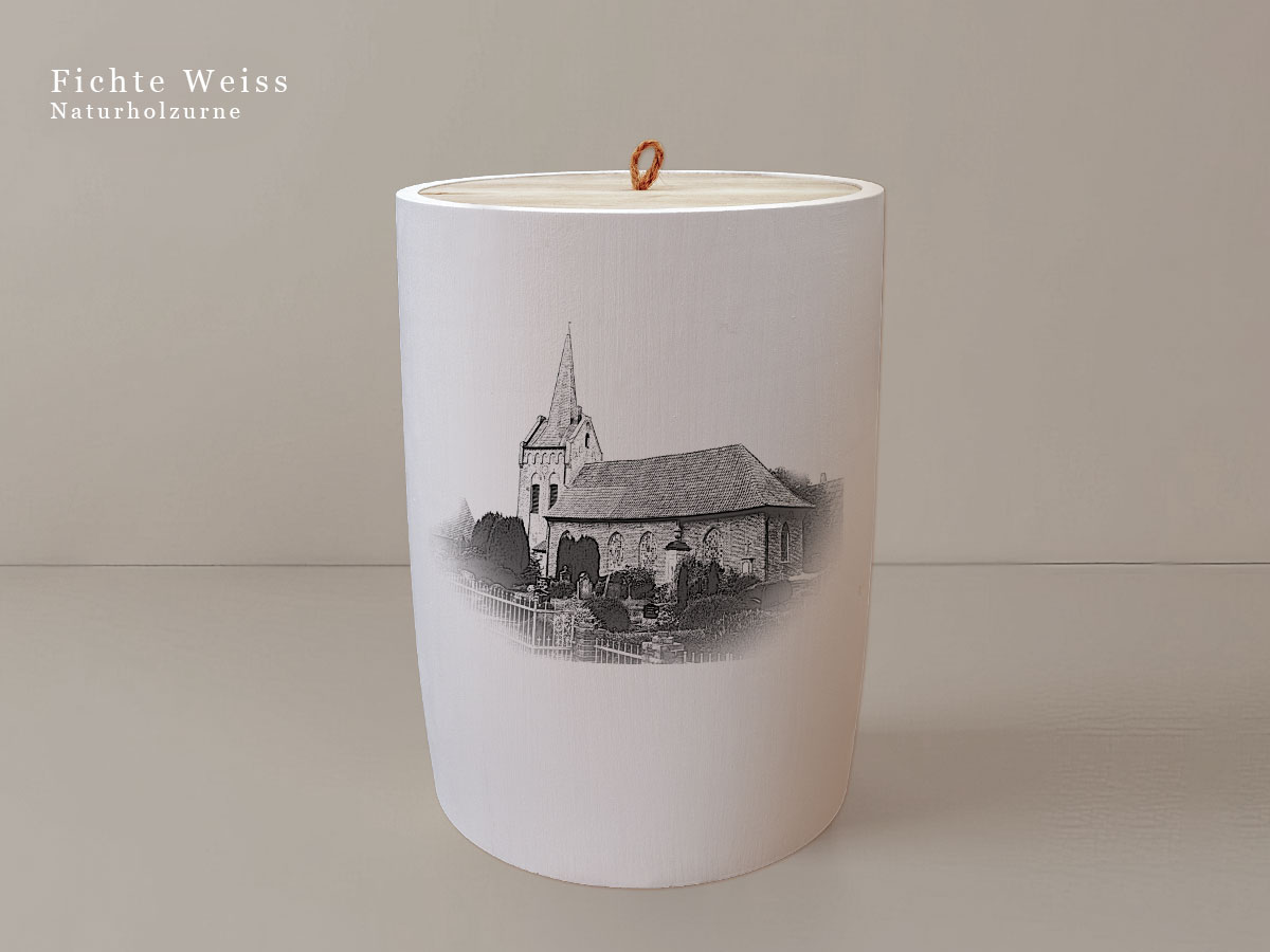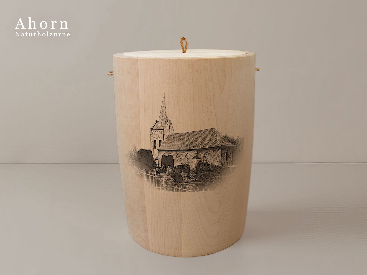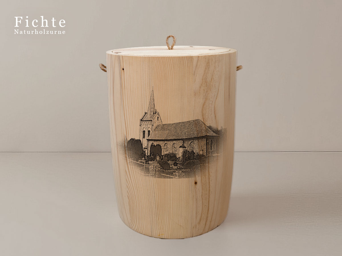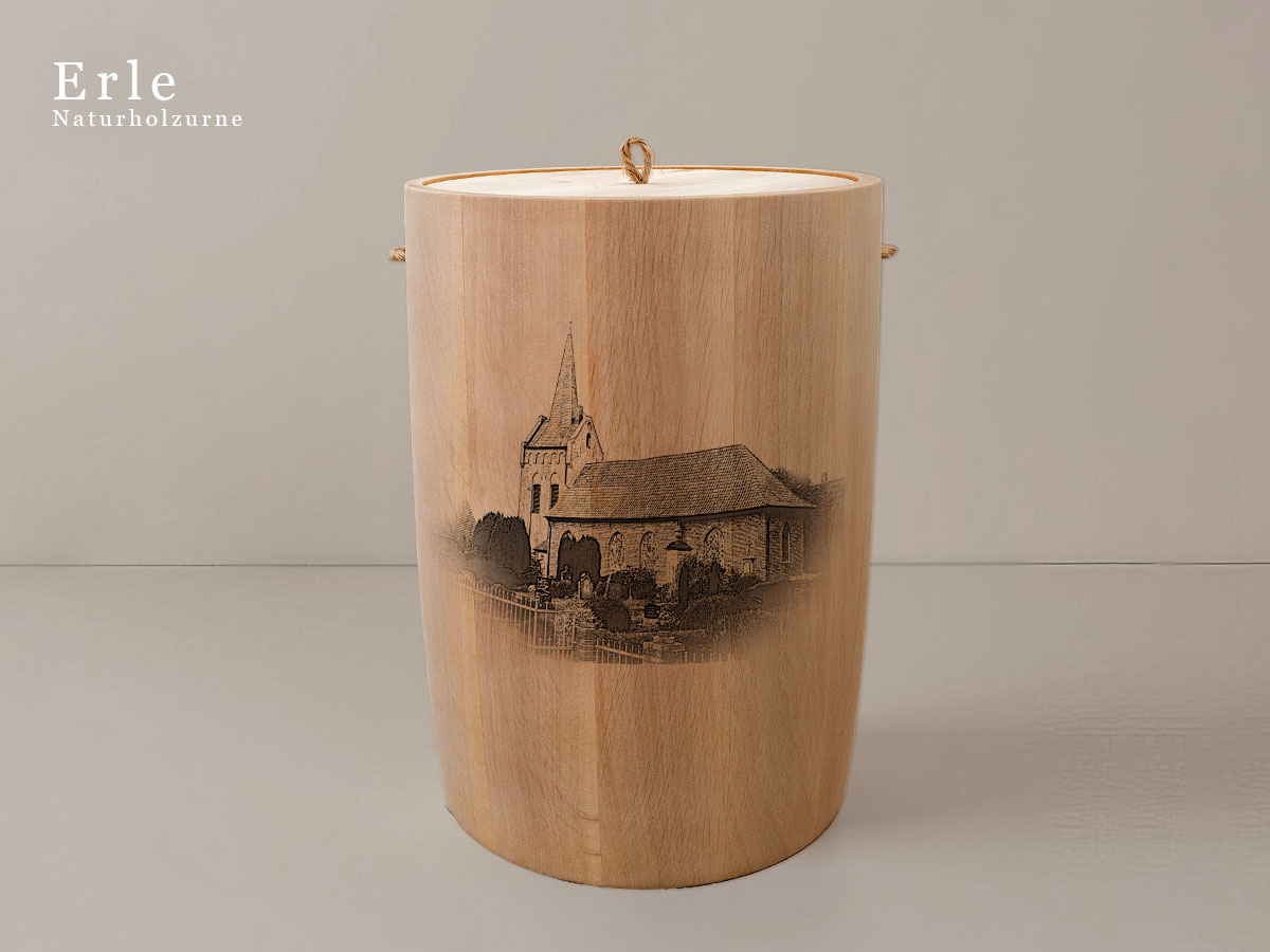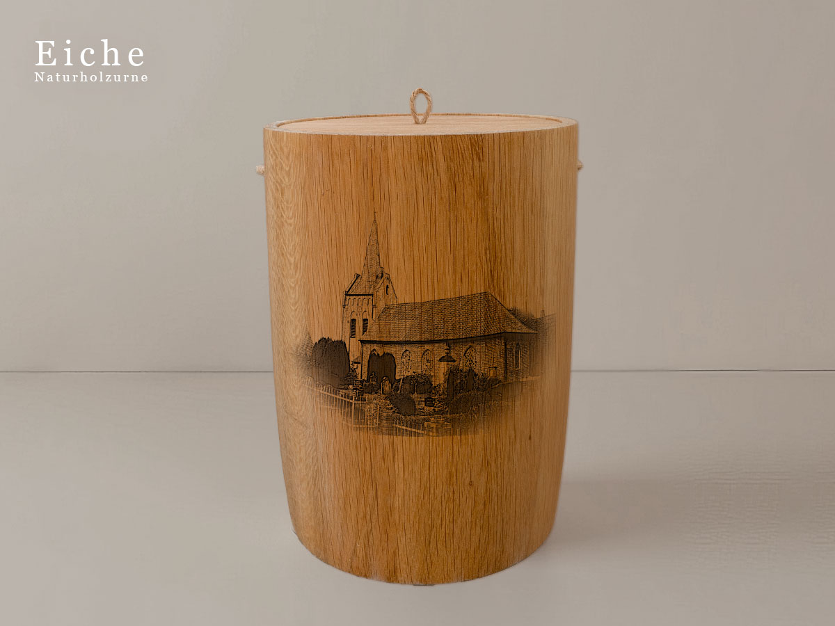 Das Motiv wird präzise in die Oberfläche der Urne gelasert, ohne Verwendung von Farben. So bleibt das natürliche Erscheinungsbild des Holzes erhalten und betont die schlichte Eleganz des Designs.