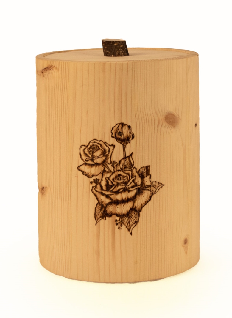 Diese Holzurne aus Fichte wurde, in unserer Manufaktur gefertigt. Der Künstler Peter Sokol hat das Motiv freihändig, nach alter Technik, in die Urne gebrannt. Die Oberfläche wurde fein geschliffen und mit reinem Leinöl veredelt.