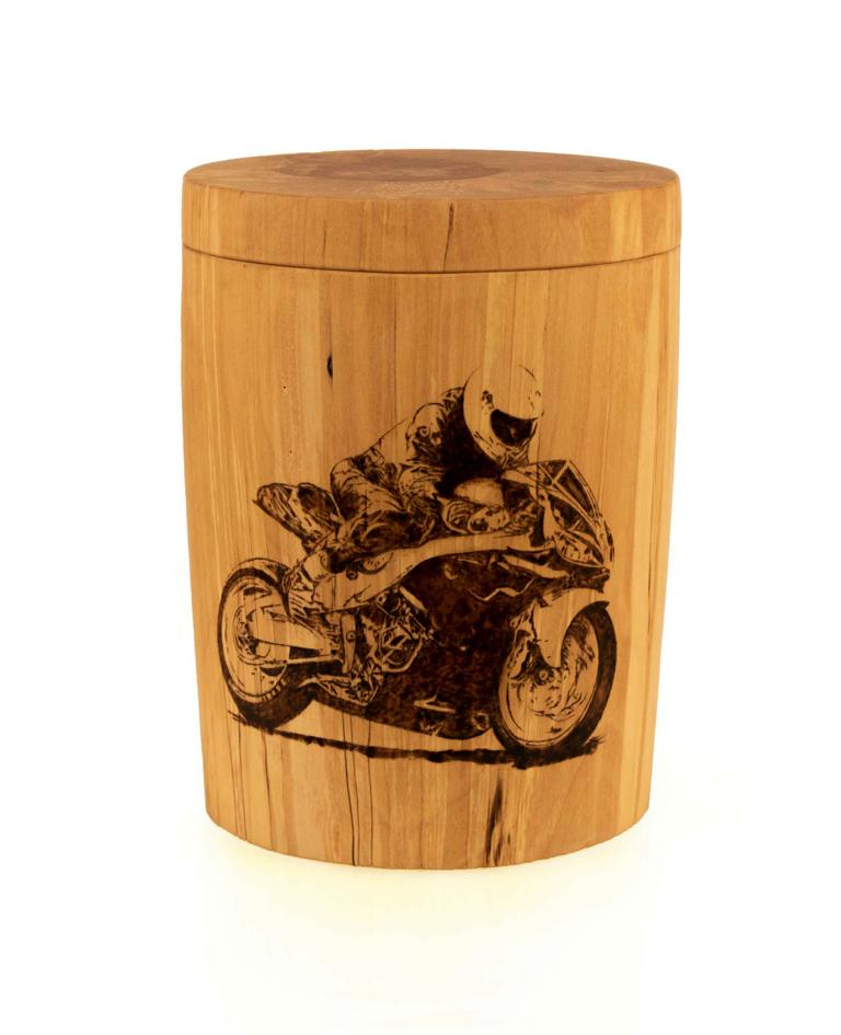 Diese Holzurne aus Birke wurde, in unserer Manufaktur aus einem Baumabschnitt gefertigt. Der Künstler Peter Sokol hat das Motiv freihändig, nach alter Technik, in die Urne gebrannt. Die Oberfläche wurde fein geschliffen und mit reinem Leinöl veredelt.