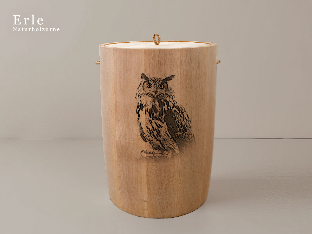 Das Motiv wird präzise in die Oberfläche der Urne gelasert, ohne Verwendung von Farben. So bleibt das natürliche Erscheinungsbild des Holzes erhalten und betont die schlichte Eleganz des Designs.