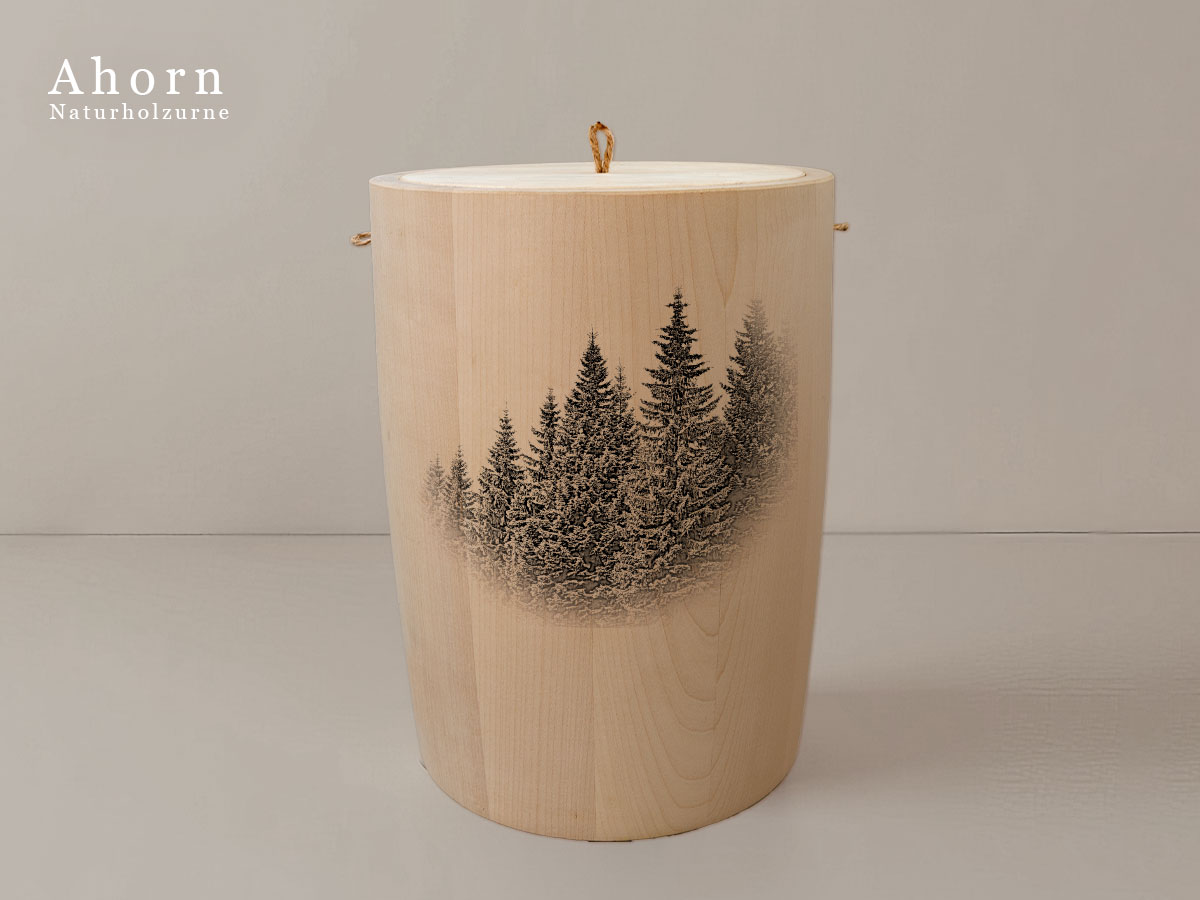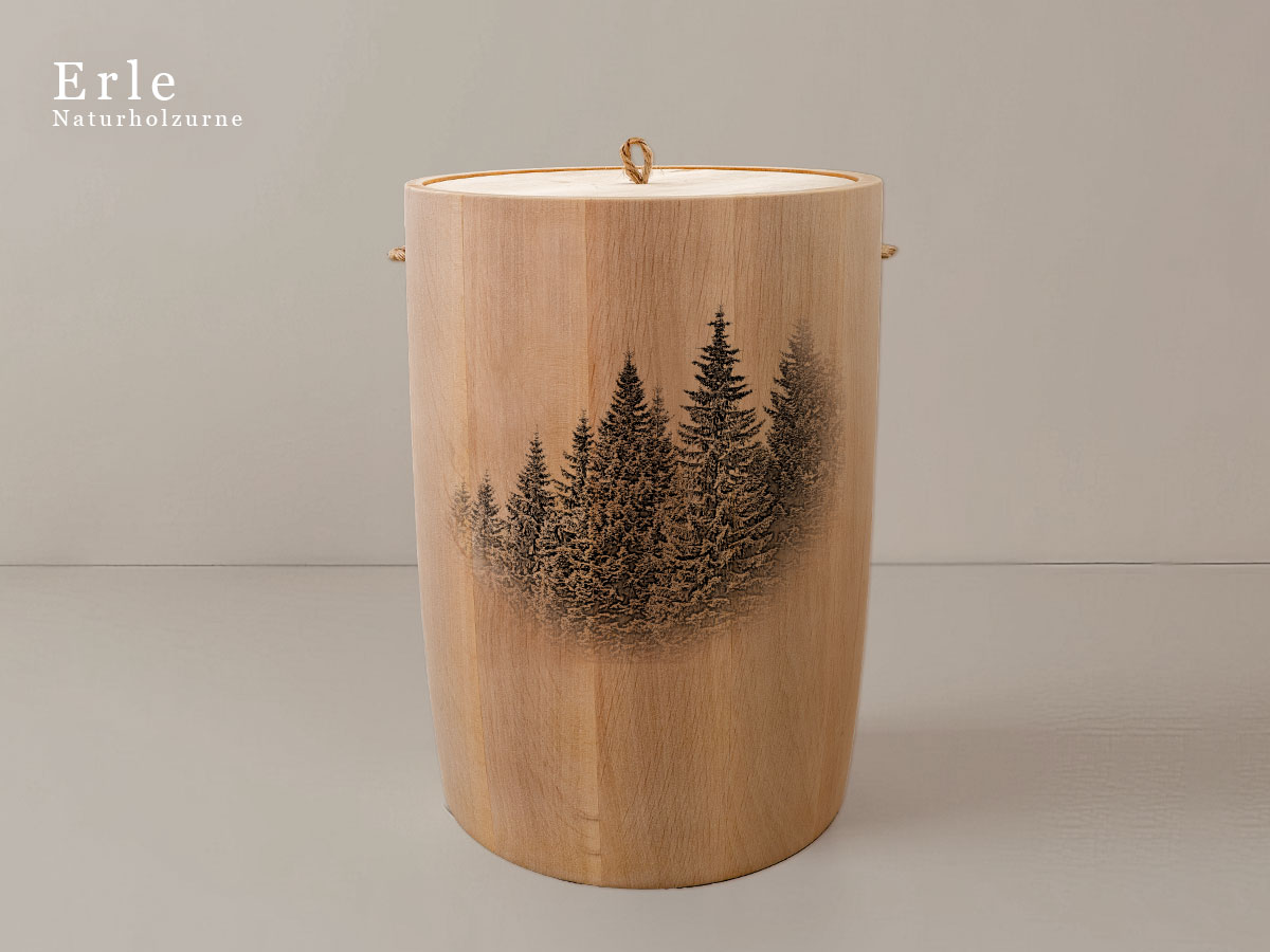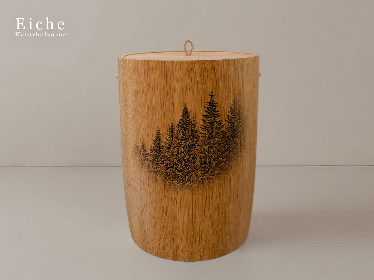 Das Motiv wird präzise in die Oberfläche der Urne gelasert, ohne Verwendung von Farben. So bleibt das natürliche Erscheinungsbild des Holzes erhalten und betont die schlichte Eleganz des Designs.