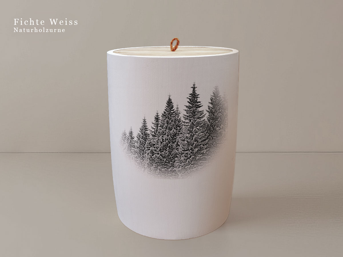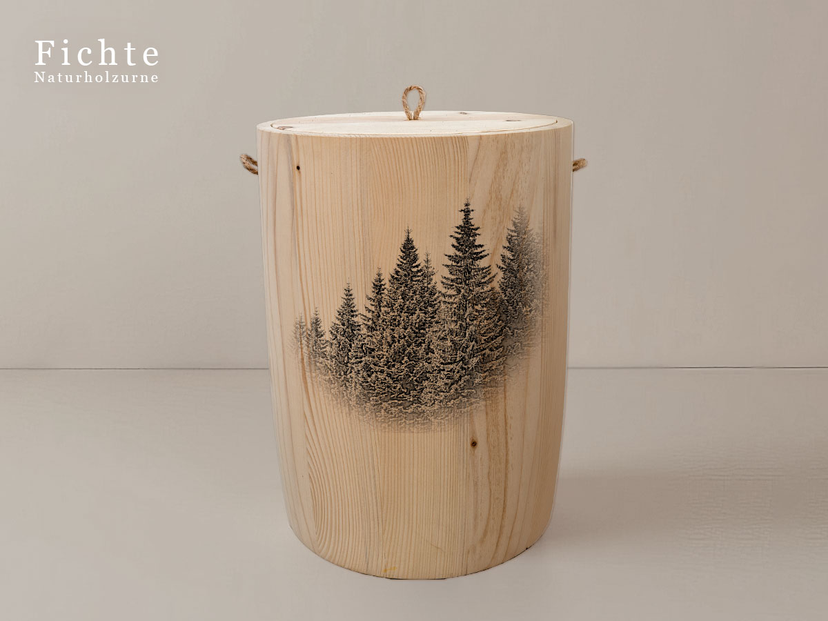 Das Motiv zeigt einen Fichtenhein und symbolisiert die Kraft und Schönheit der Natur. Es steht für Wachstum, Beständigkeit und die tiefe Verbindung zur natürlichen Welt – Werte, die in Erinnerung bleiben sollen.