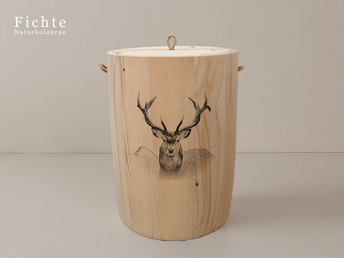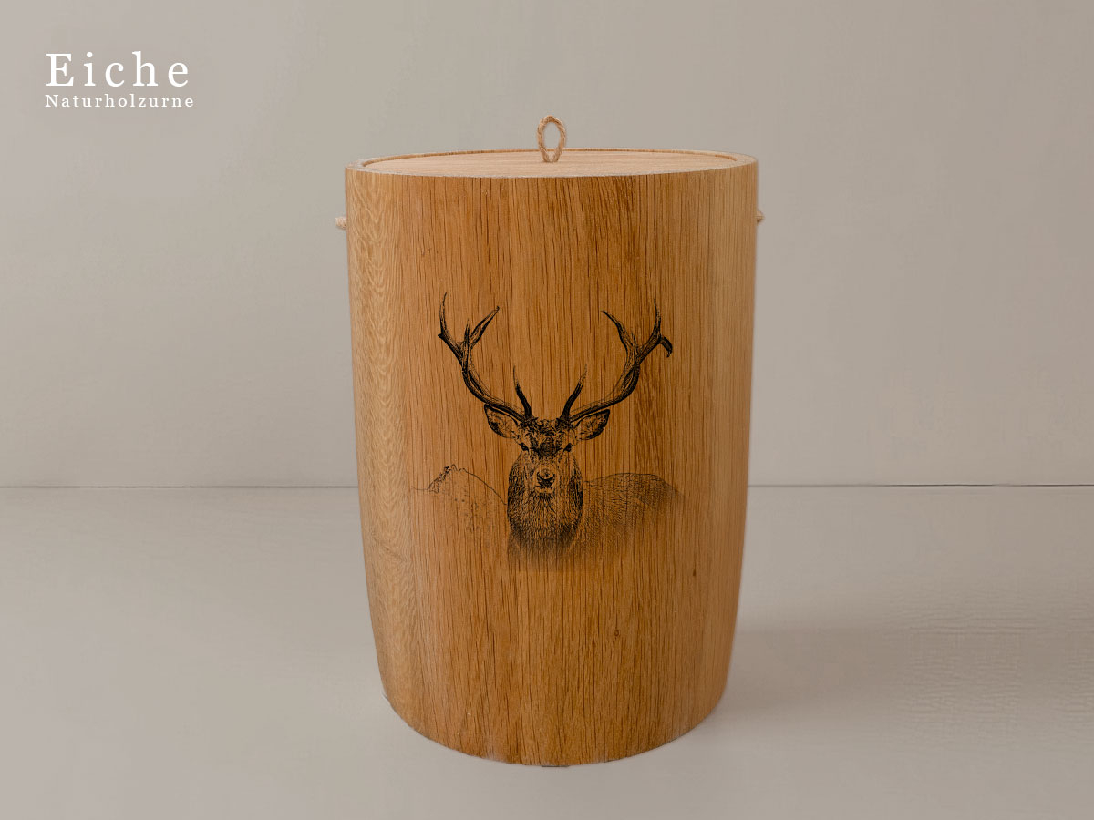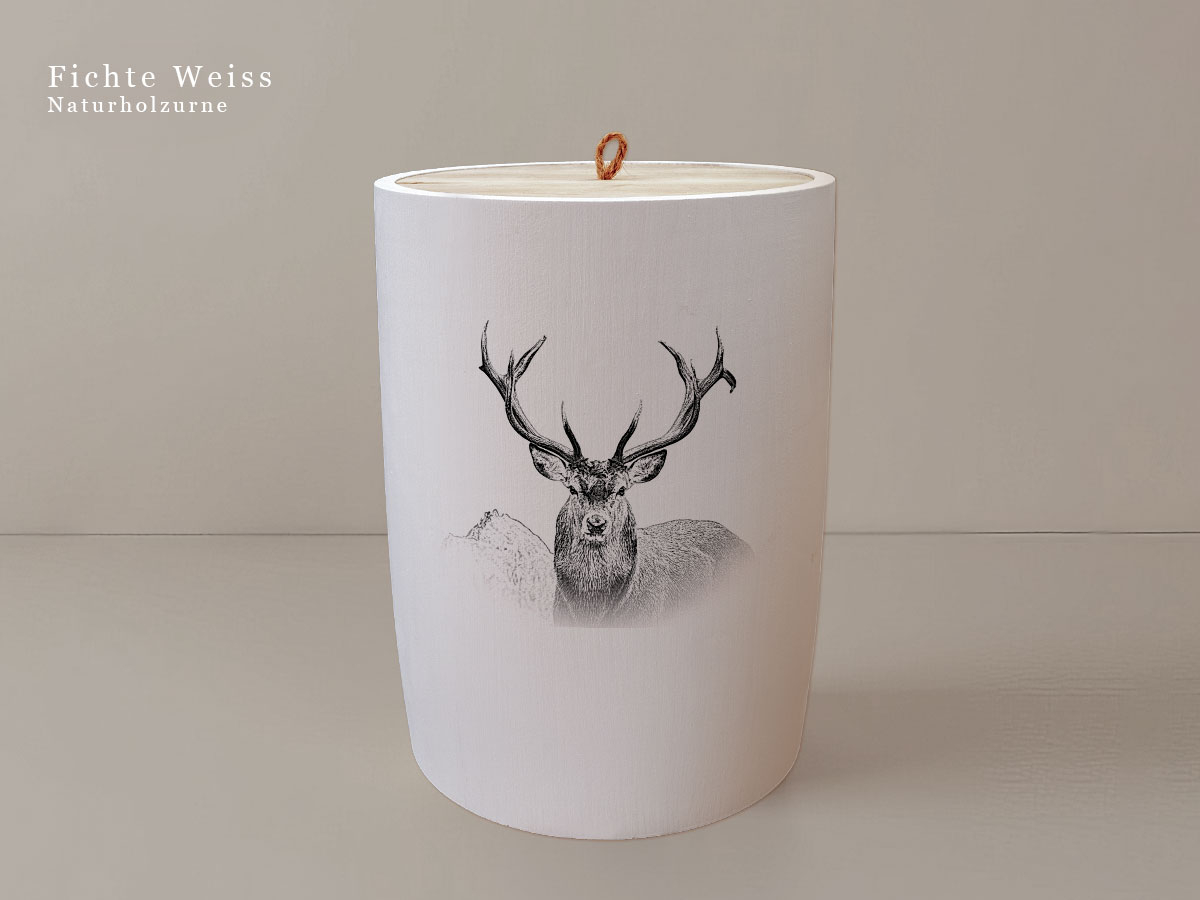 Das Motiv zeigt einen majestätischen Hirsch und symbolisiert die Kraft und Schönheit der Natur. Es steht für Wachstum, Beständigkeit und die tiefe Verbindung zur natürlichen Welt – Werte, die in Erinnerung bleiben sollen.