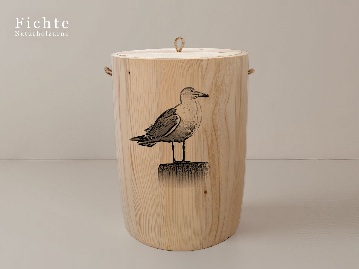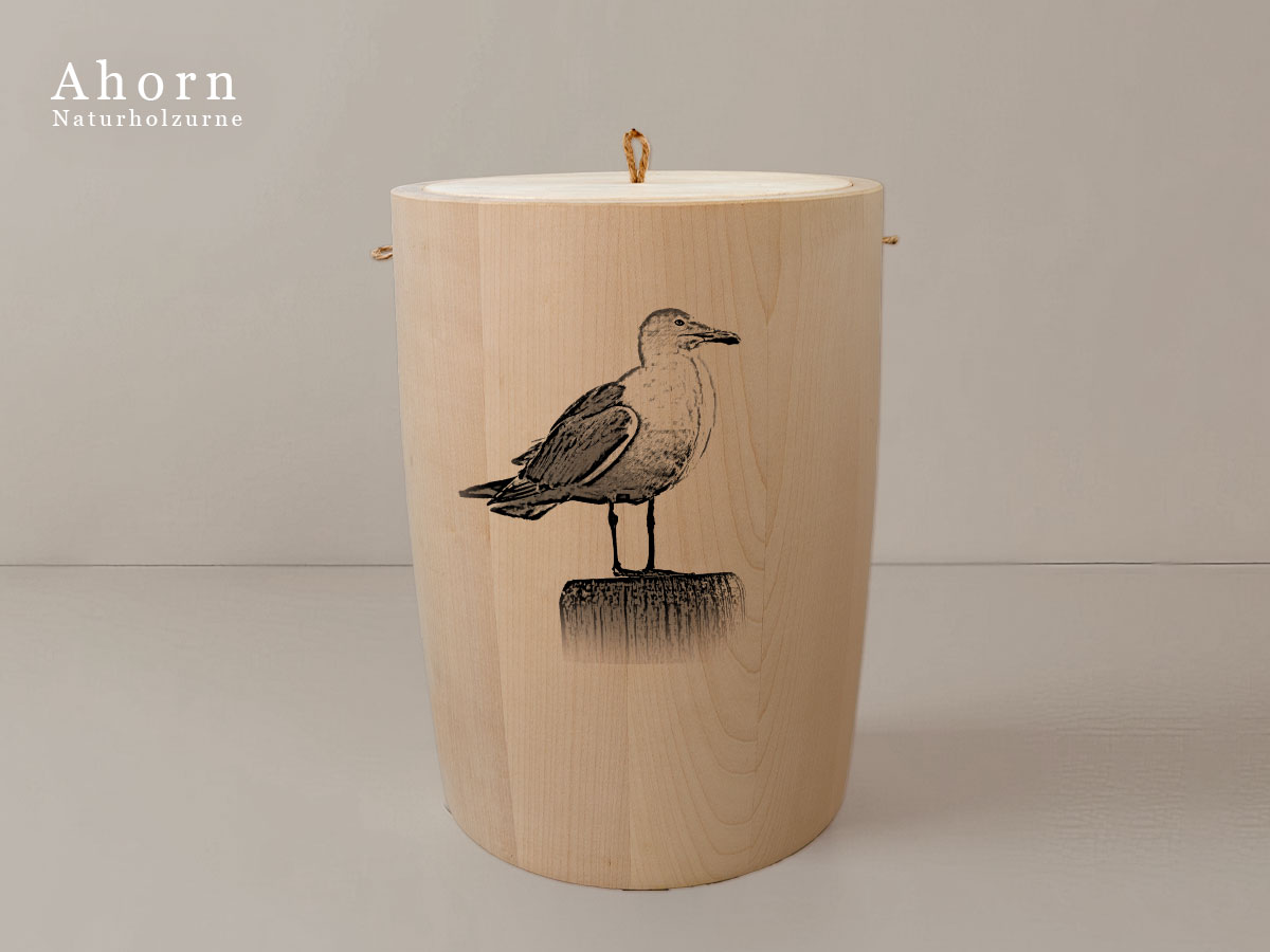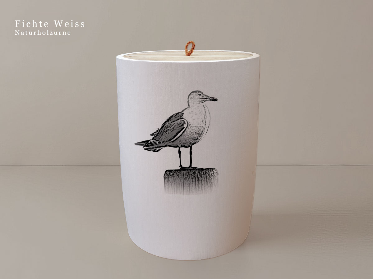 Das Motiv zeigt eine Möwe und symbolisiert die Kraft und Schönheit der Natur. Es steht für Wachstum, Beständigkeit und die tiefe Verbindung zur natürlichen Welt – Werte, die in Erinnerung bleiben sollen.