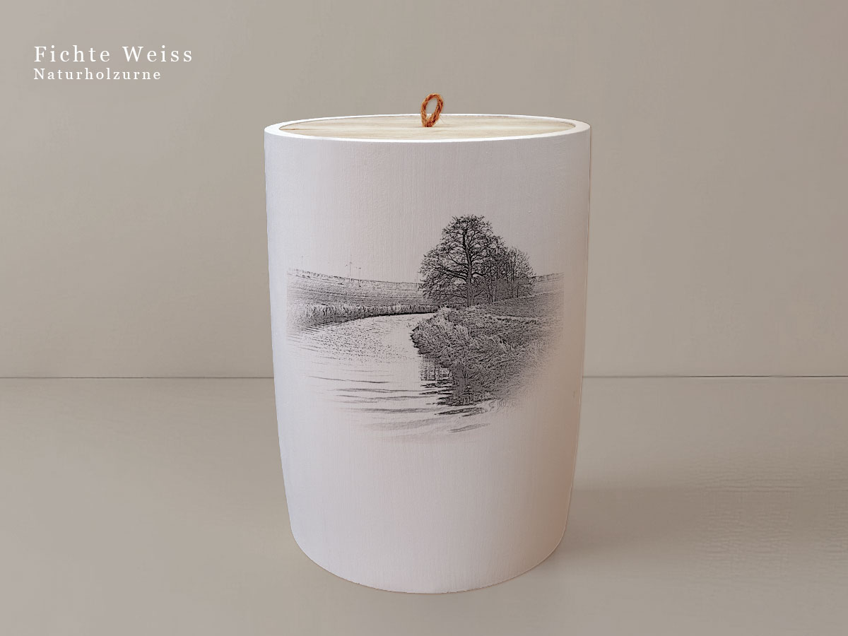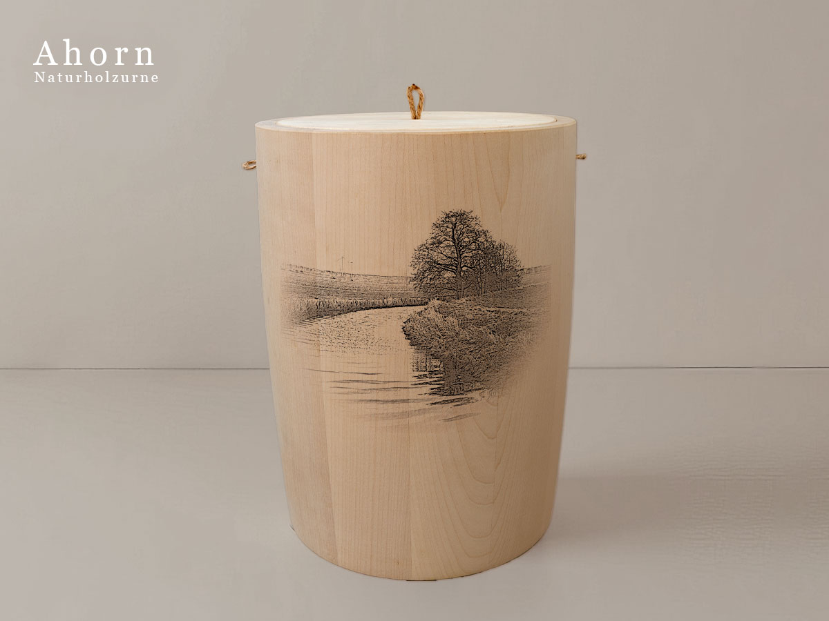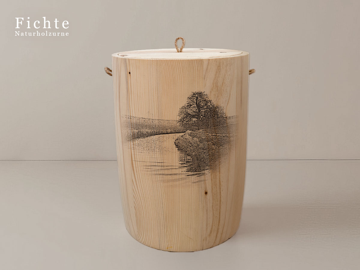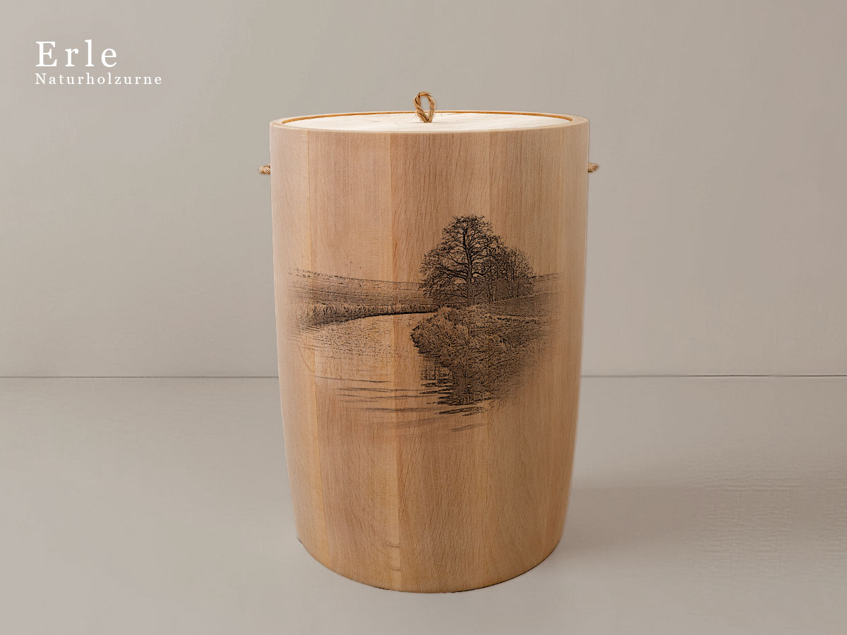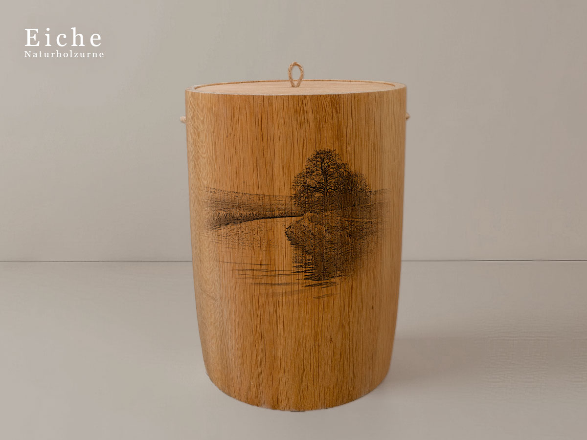 Das Motiv wird präzise in die Oberfläche der Urne gelasert, ohne Verwendung von Farben. So bleibt das natürliche Erscheinungsbild des Holzes erhalten und betont die schlichte Eleganz des Designs.
