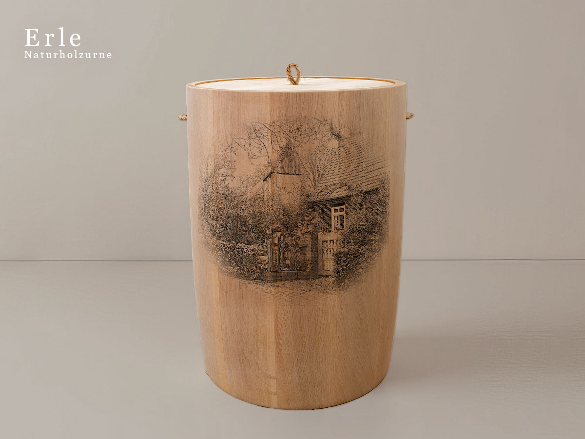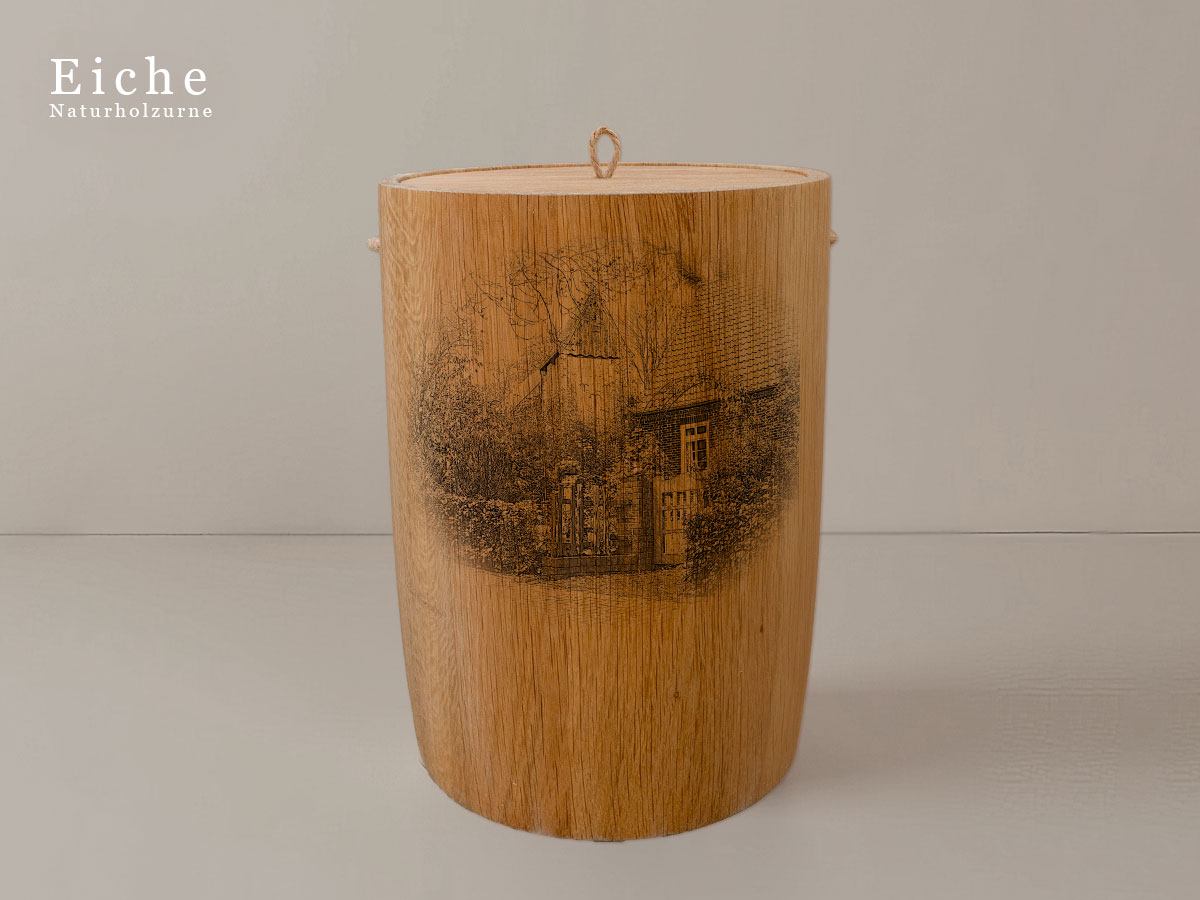 Das Motiv wird präzise in die Oberfläche der Urne gelasert, ohne Verwendung von Farben. So bleibt das natürliche Erscheinungsbild des Holzes erhalten und betont die schlichte Eleganz des Designs.