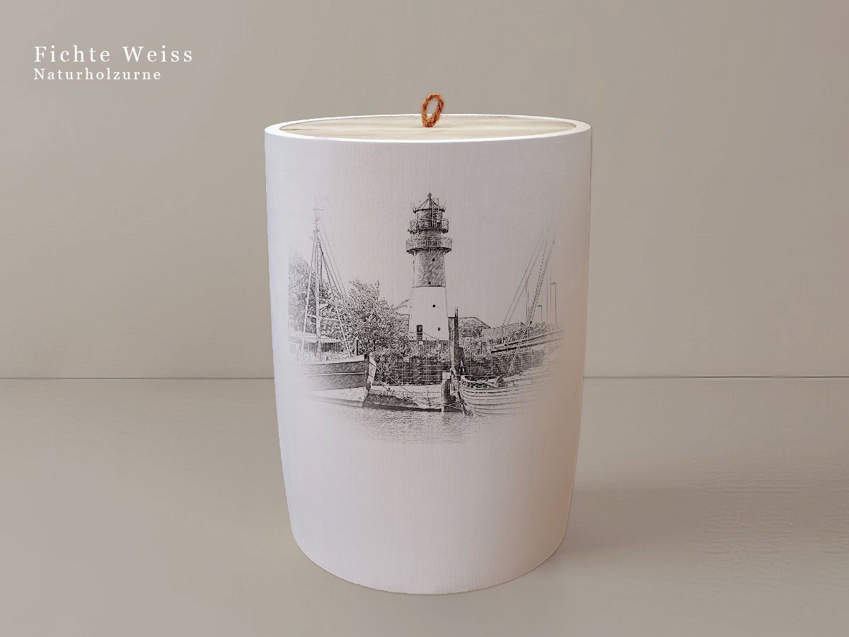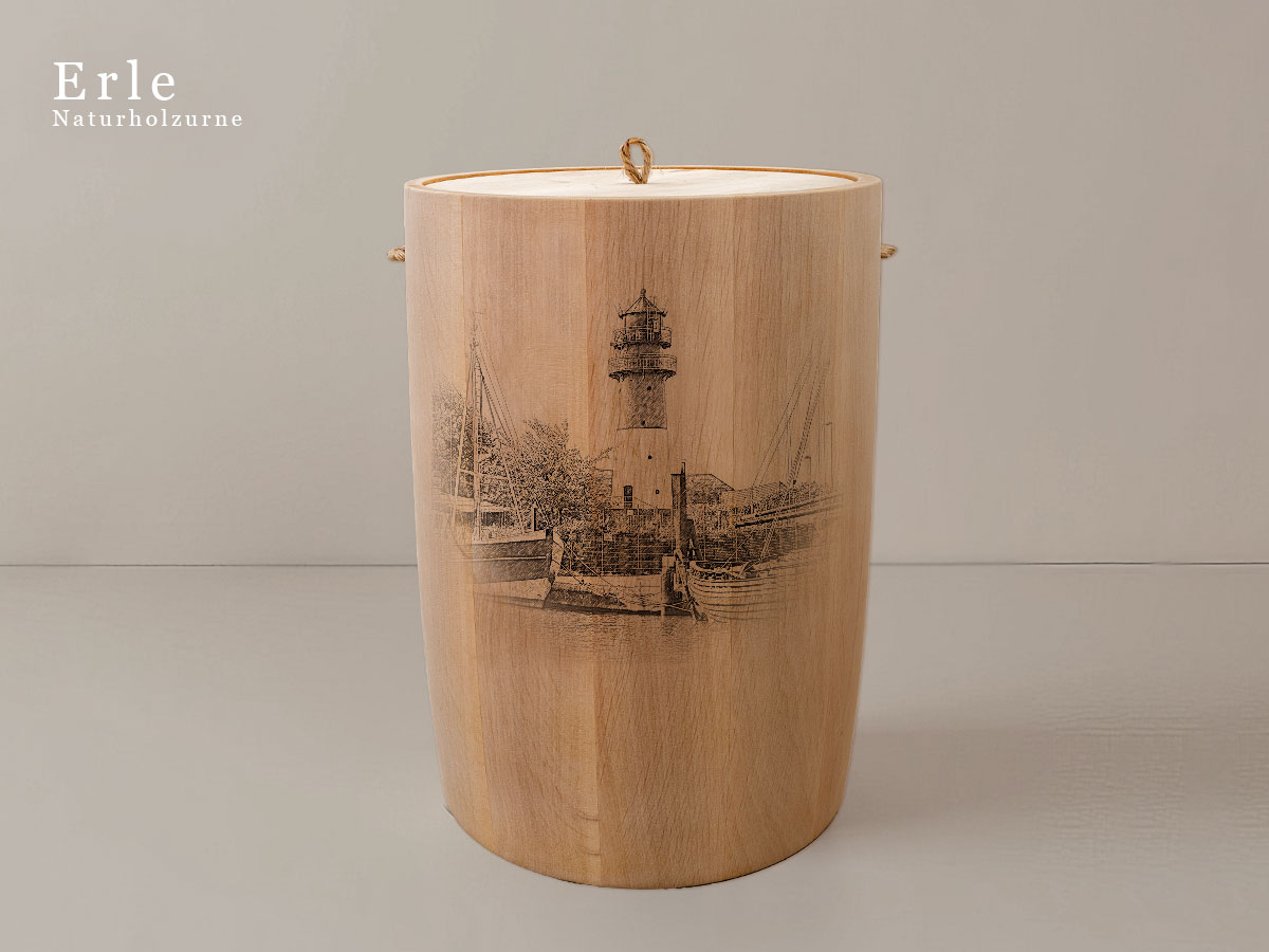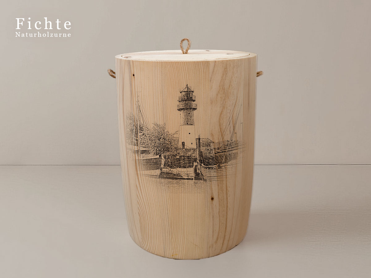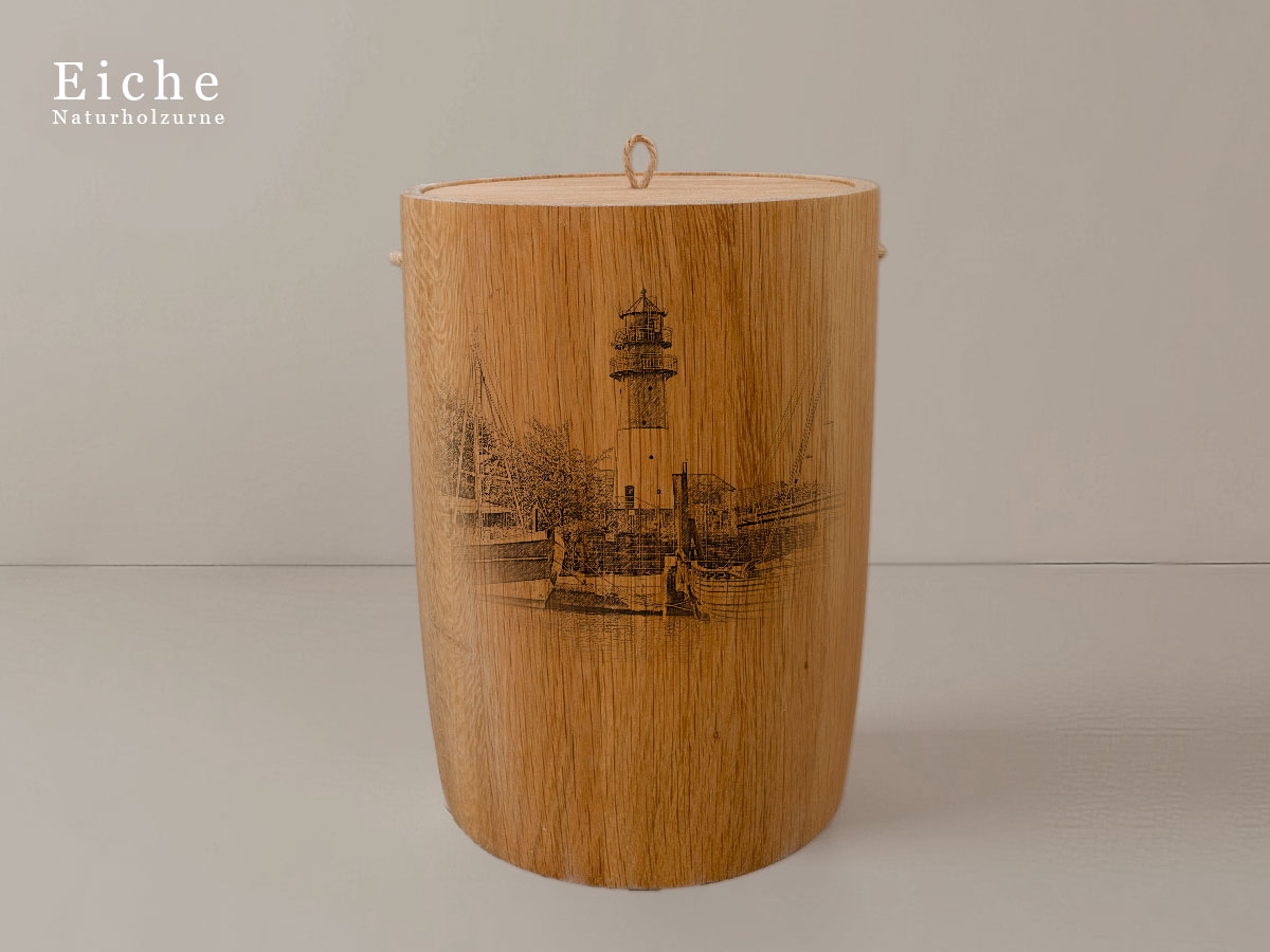 Das Motiv wird präzise in die Oberfläche der Urne gelasert, ohne Verwendung von Farben. So bleibt das natürliche Erscheinungsbild des Holzes erhalten und betont die schlichte Eleganz des Designs.