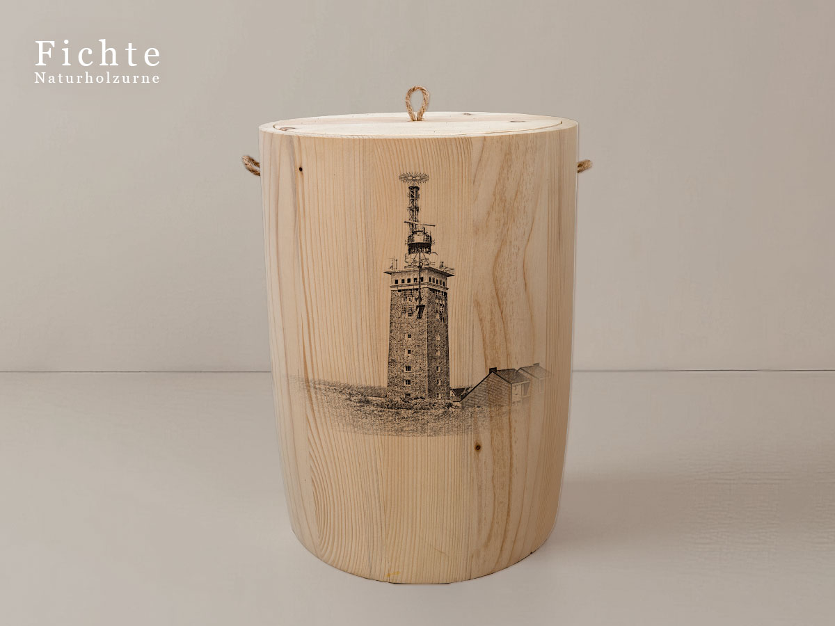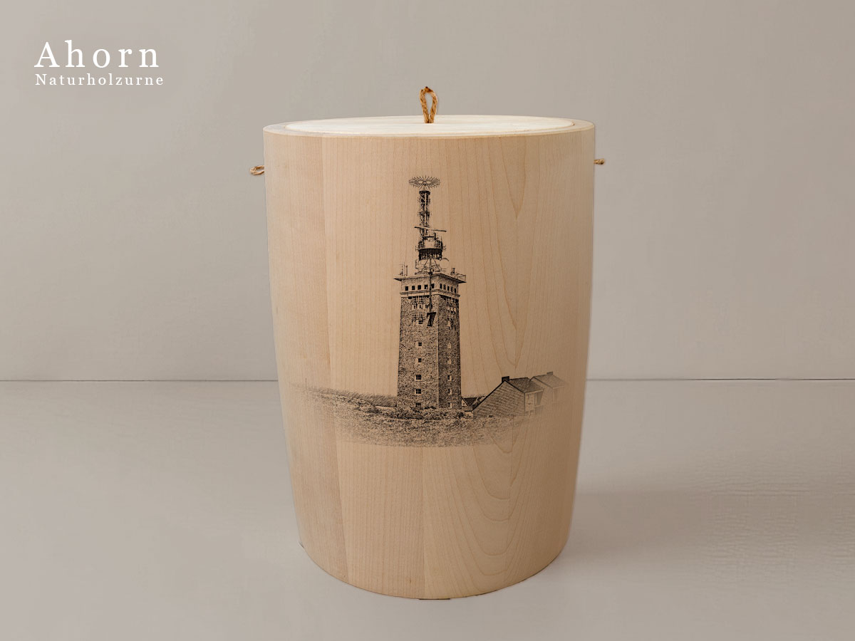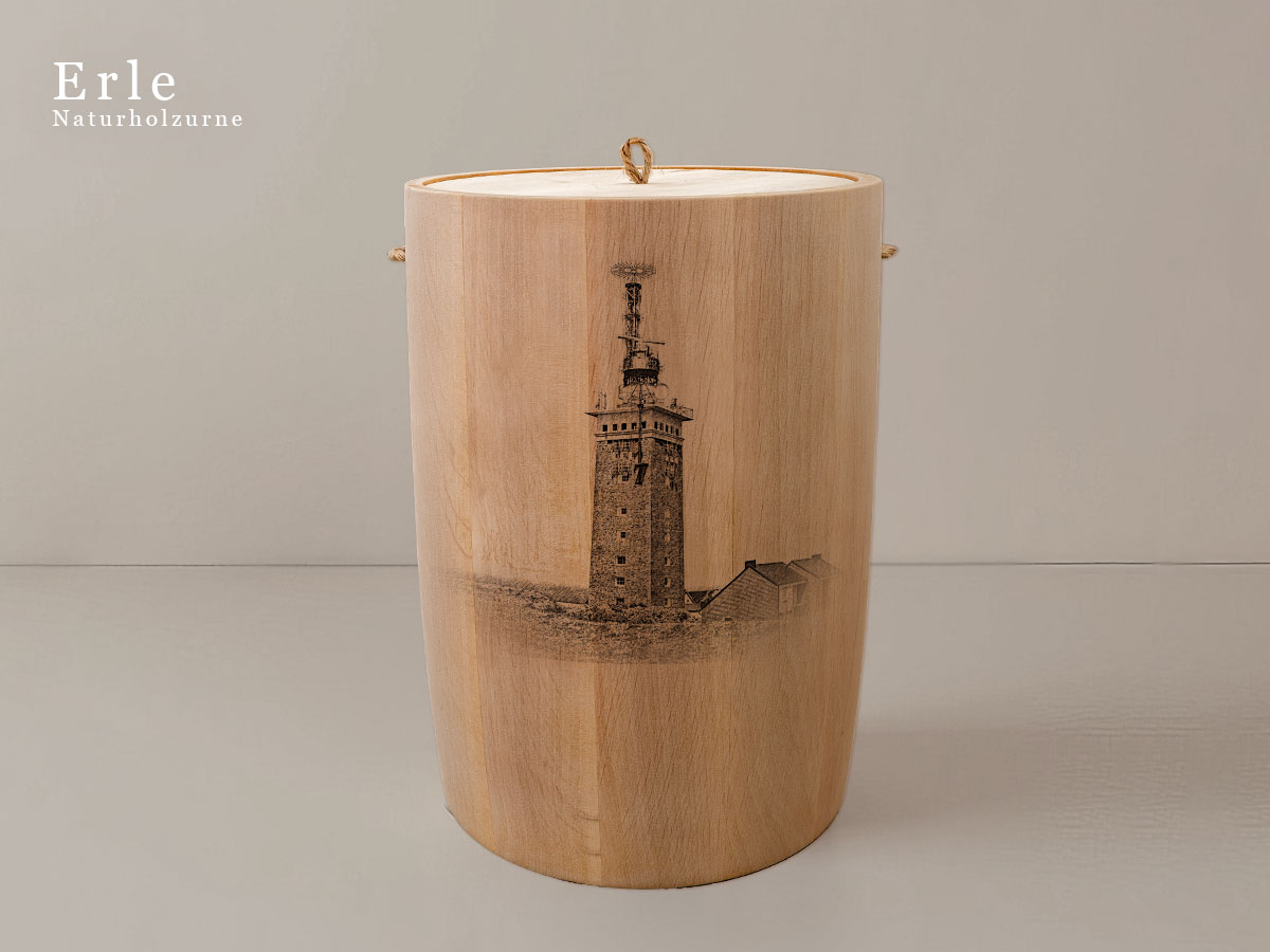 Das Motiv wird präzise in die Oberfläche der Urne gelasert, ohne Verwendung von Farben. So bleibt das natürliche Erscheinungsbild des Holzes erhalten und betont die schlichte Eleganz des Designs.