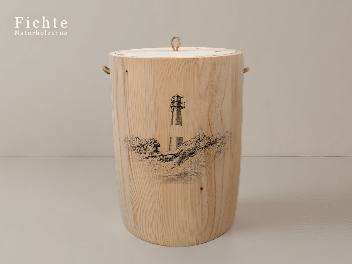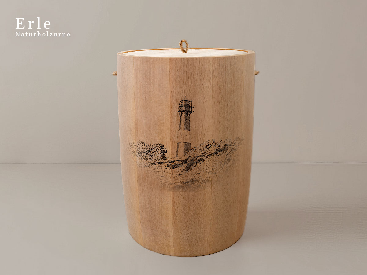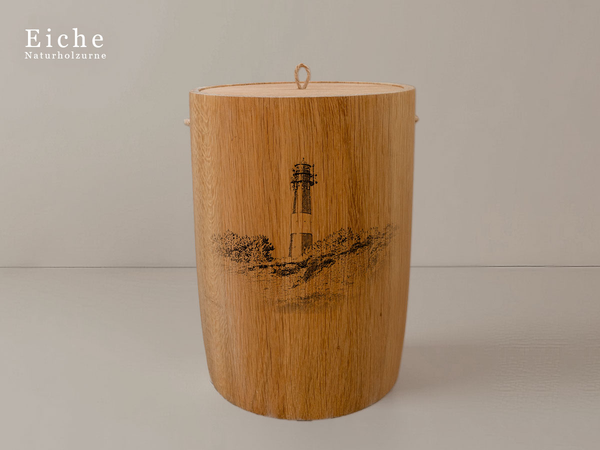 Das Motiv wird präzise in die Oberfläche der Urne gelasert, ohne Verwendung von Farben. So bleibt das natürliche Erscheinungsbild des Holzes erhalten und betont die schlichte Eleganz des Designs.