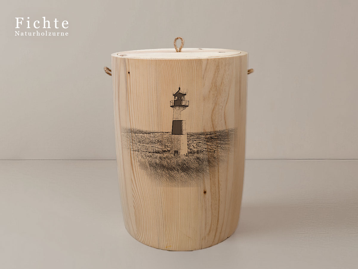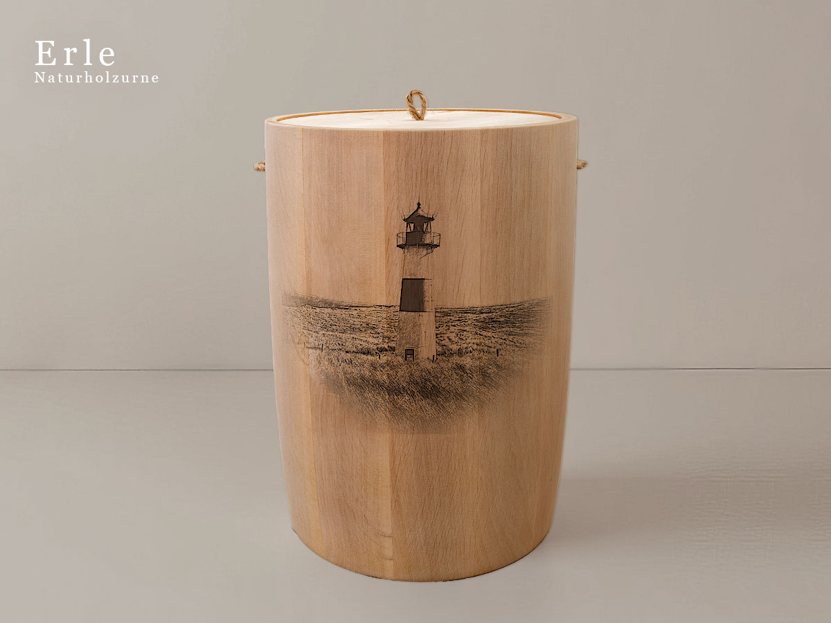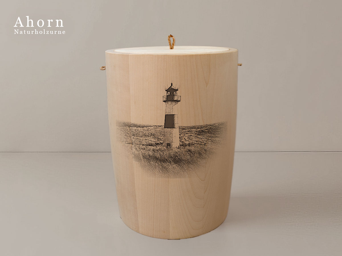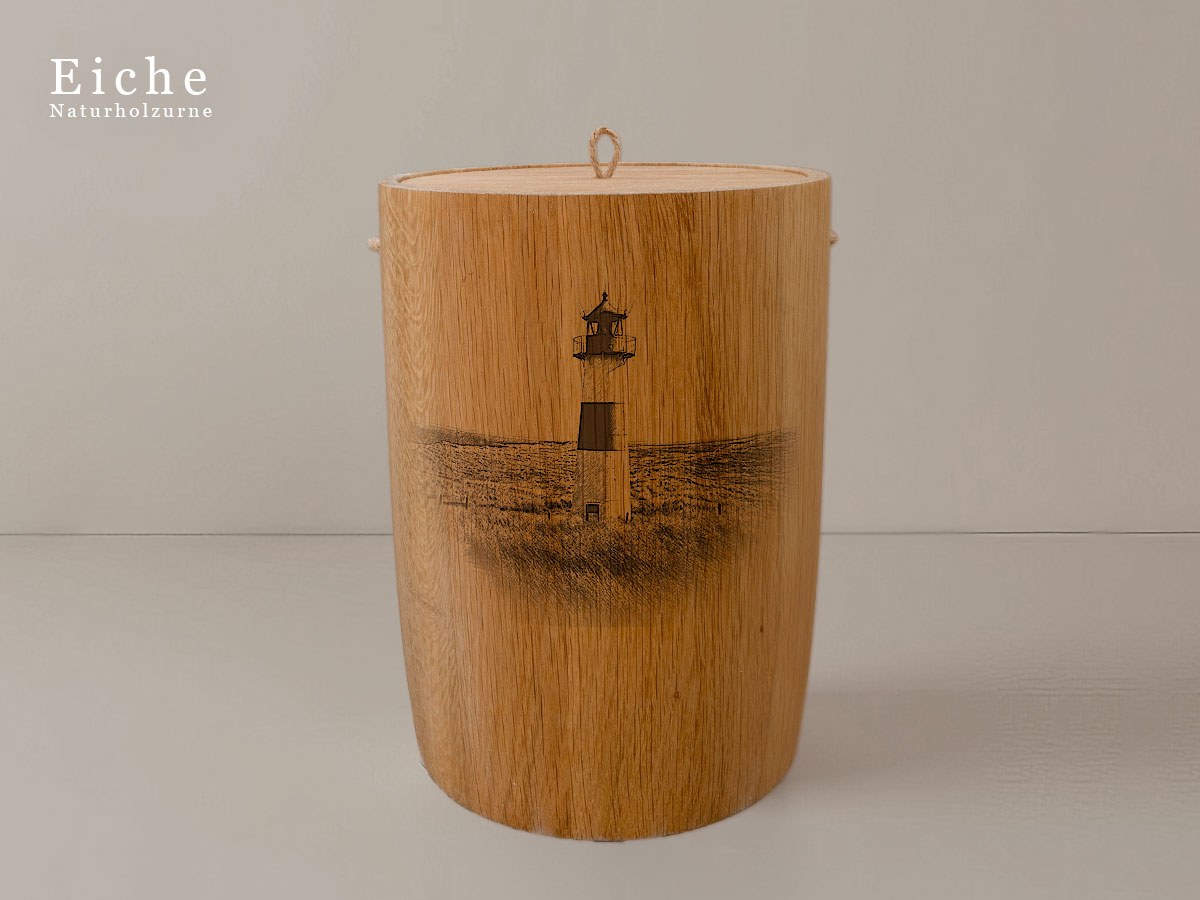 Das Motiv wird präzise in die Oberfläche der Urne gelasert, ohne Verwendung von Farben. So bleibt das natürliche Erscheinungsbild des Holzes erhalten und betont die schlichte Eleganz des Designs.