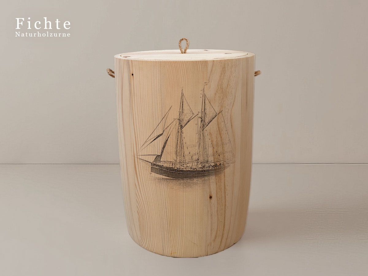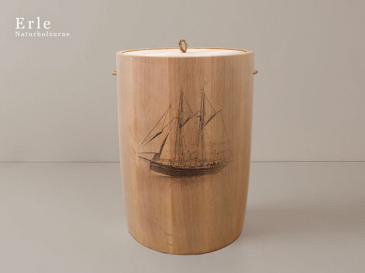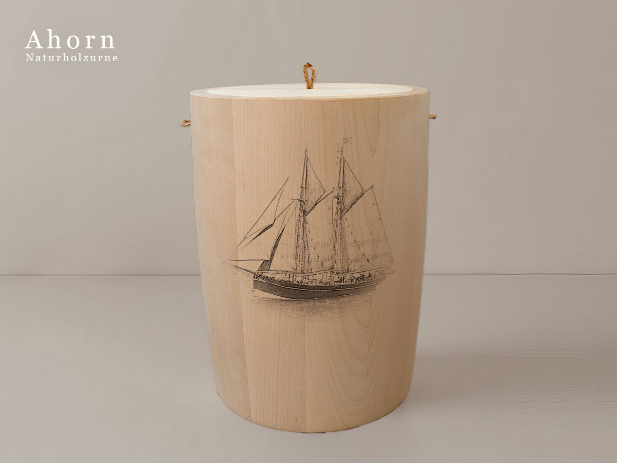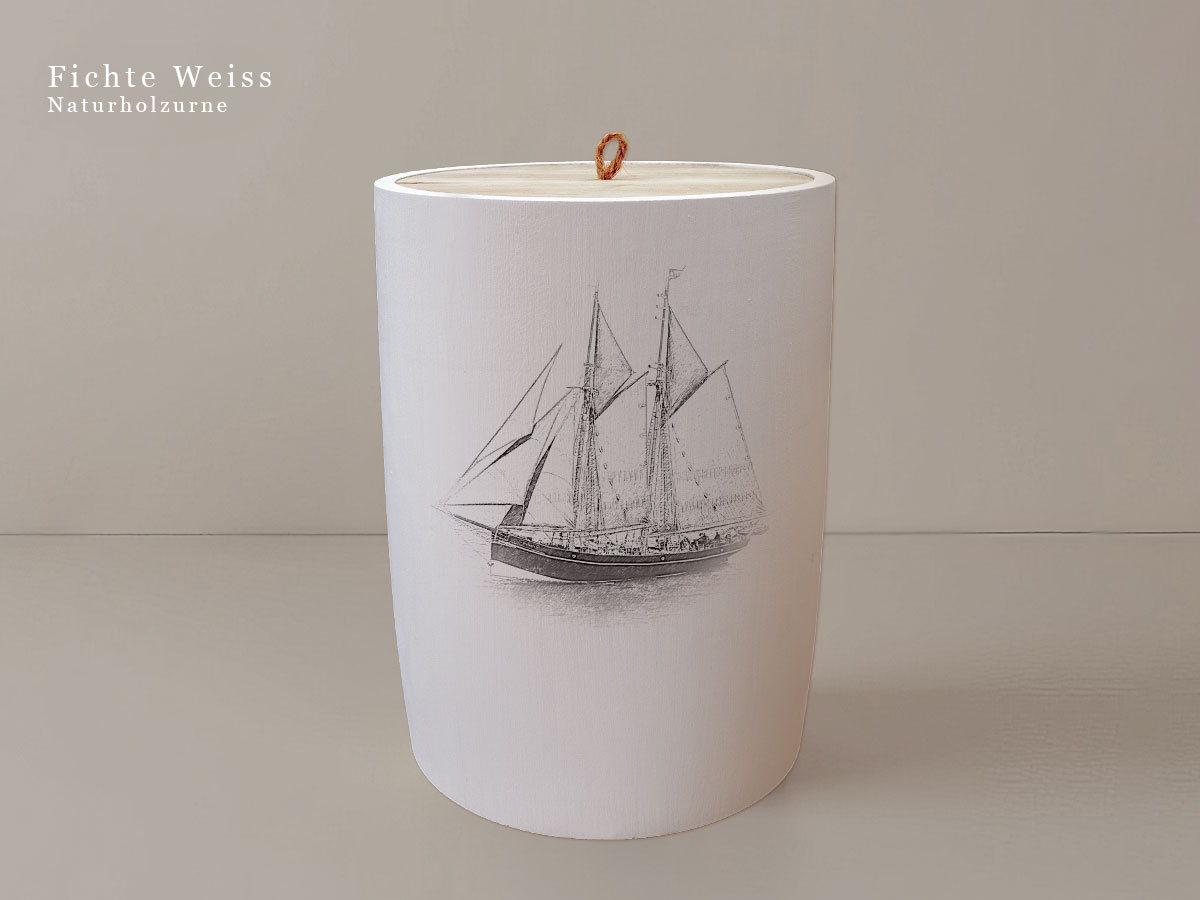 Das maritime Schiffsmotiv eines Segelschoners steht für Beständigkeit, Freiheit und die Verbindung zur See – Werte, die in Erinnerung bleiben sollen.