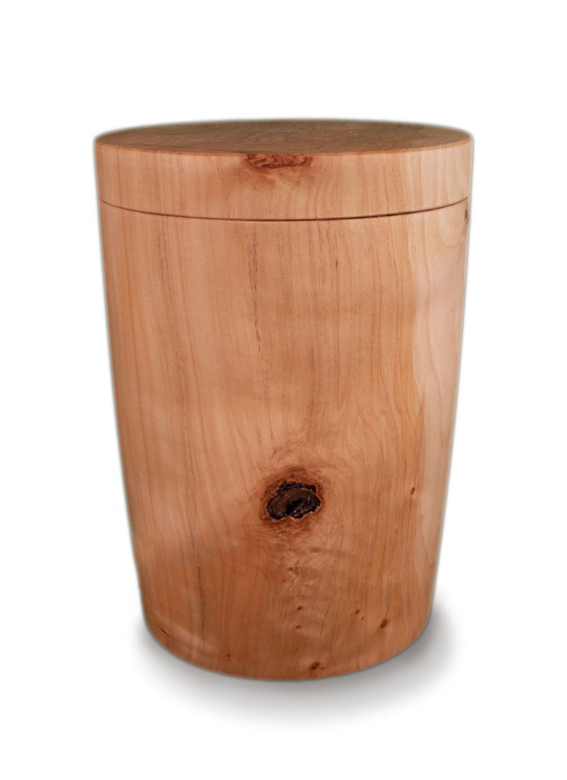 Diese Holzurne aus Schwarzerle wurde erst an der Luft dann in unseren Trockenkammer auf 10% Restfeuchte getrocknet und das war es auch schon! Das Holz wurde nicht weiter behandelt, kein Leim! Erst wird sie vorgedrechselt und der Deckel abgeschnitten danach getrocknet. Der Deckel wurde nach dem trocknen mit drei Buchendübel befestigt und die Urne von Hand fertig gedrechselt. Die Oberfläche wurde fein geschliffen und mit reinem Leinöl veredelt.