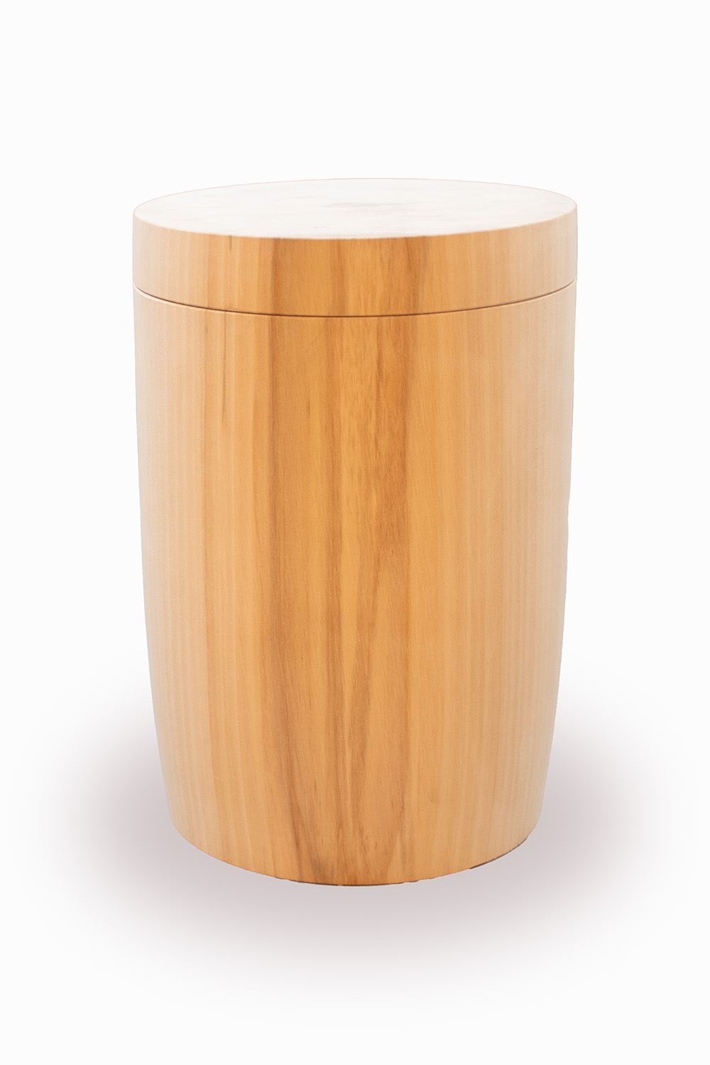 Diese Holzurne aus Lindenholz wurde erst an der Luft dann in unseren Trockenkammer auf 10% Restfeuchte getrocknet und das war es auch schon! Das Holz wurde nicht weiter behandelt, kein Leim! Erst wird sie vorgedrechselt und der Deckel abgeschnitten danach getrocknet. Der Deckel wurde nach dem trocknen mit drei Buchendübel befestigt und die Urne von Hand fertig gedrechselt. Die Oberfläche wurde fein geschliffen und mit reinem Leinöl veredelt.