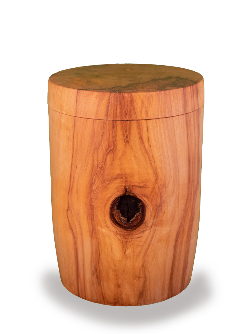 Diese Holzurne aus Kastanie wurde erst an der Luft dann in unseren Trockenkammer auf 10% Restfeuchte getrocknet und das war es auch schon! Das Holz wurde nicht weiter behandelt, kein Leim! Erst wird sie vorgedrechselt und der Deckel abgeschnitten danach getrocknet. Der Deckel wurde nach dem trocknen mit drei Buchendübel befestigt und die Urne von Hand fertig gedrechselt. Die Oberfläche wurde fein geschliffen und mit reinem Leinöl veredelt.
